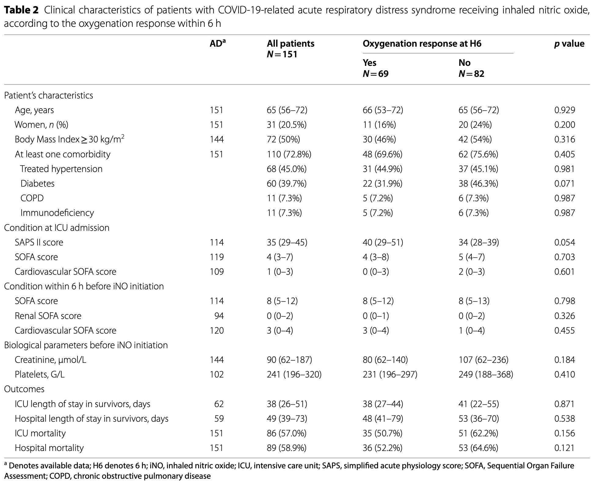 Supplementary Information The online version contains supplementary material available at https:// doi. org/ 10. 1186/ s13613-023-01150-9 . Additional file 1: Table S1 . Clinical characteristics of patients with COVID-19-related acute respiratory distress syndrome receiving inhaled nitric oxide in patients evaluable at 6 h following iNO and the others. Table S2 . Respiratory parameters and modalities of inhaled nitric oxide administration in patients with COVID-19-related acute respiratory distress syndrome in patients evaluable at 6 h following iNO and the others. Table S3 . Oxygenation response to inhaled nitric oxide therapy in patients with COVID-19-related acute respiratory distress syndrome. Table S4 . Change in arterial blood gas variables within 6 h of inhaled nitric oxide therapy in patients with COVID-19-related mild, moderate and severe acute respiratory distress syndrome. Author contributions AMD, LP, MSc, AM, PH, LL and AVB had full access to all the data in the study and took responsibility for the integrity of the data and the accuracy of the data analysis. AMD, LP, SN, BM, LH, JFT, JLT, KK, MG, MSl, AM and AVB collected the data. Statistical analyses have been performed under the supervision of MSc according to a predefined statistical plan reviewed by the scientific committee. This scientific committee was composed of LP, AM, AVB and AMD. Interpretation of results, manuscript drafting and submission was the responsibility of the scientific committee...
