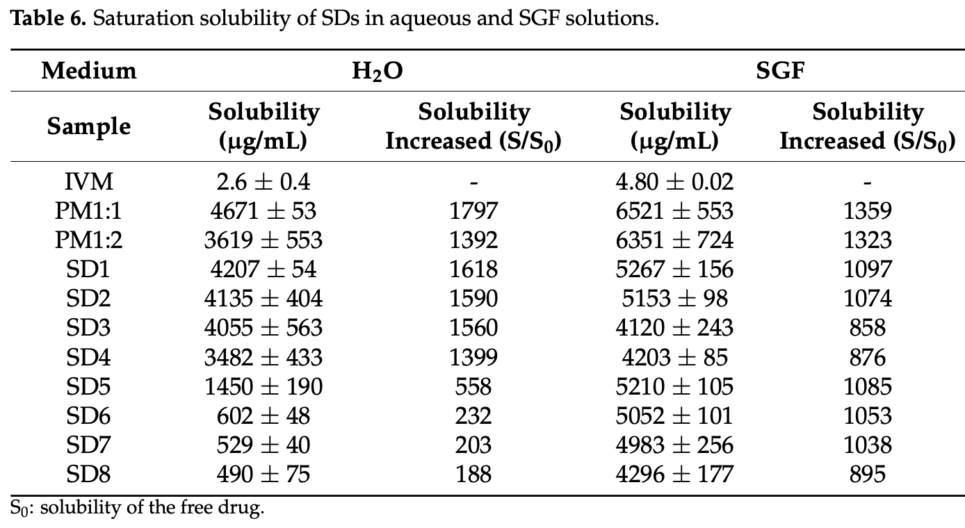 In vitro study showing that poloxamer 407 (P407)-based solid dispersions of ivermectin significantly improve aqueous solubility, dissolution, and drug release compared to pure ivermectin.