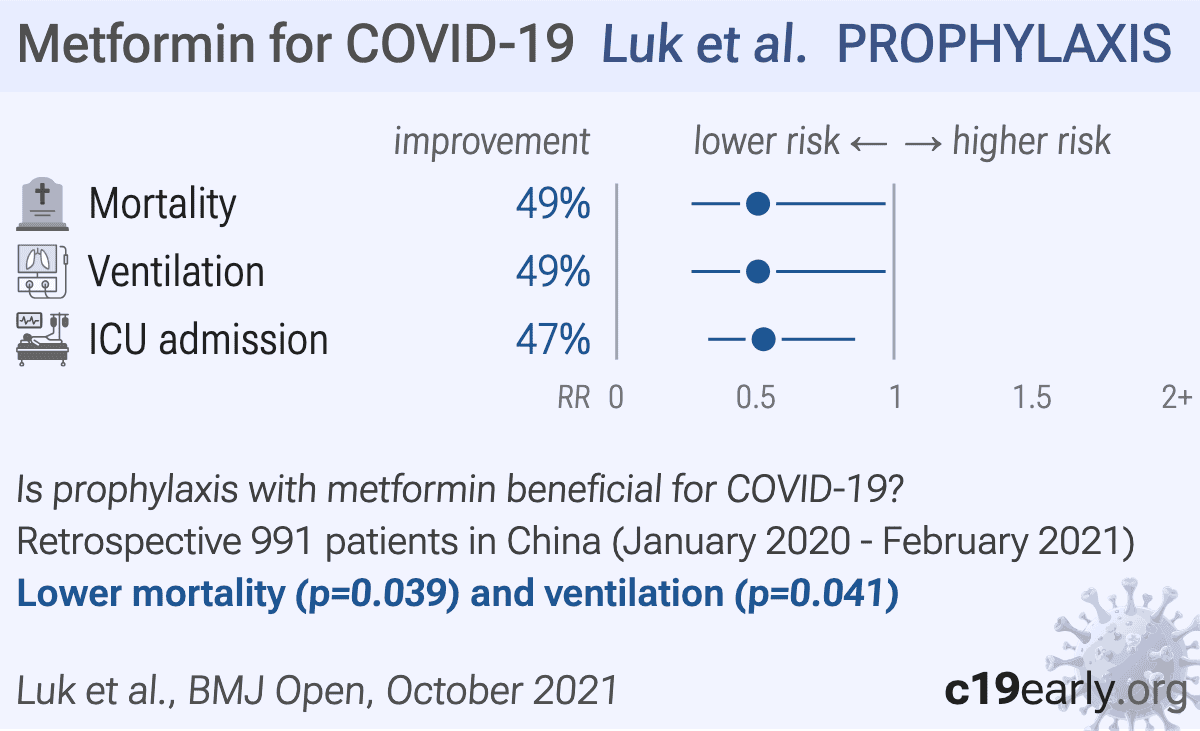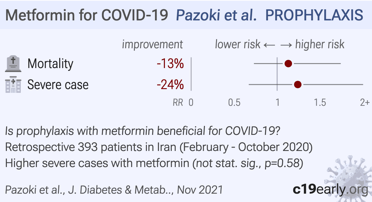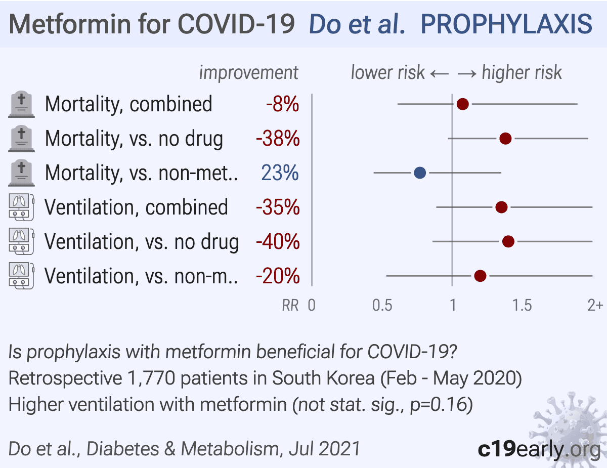 Most studies analyze existing use with diabetic patients. Prophylaxis results typically include continuing use after infection and hospitalization, and greater benefit is seen for more serious outcomes. The TOGETHER RCT shows 27% lower mortality. While not statistically significant, p = 0.53, this is consistent with the mortality results from all studies, 36% [32‑40%].