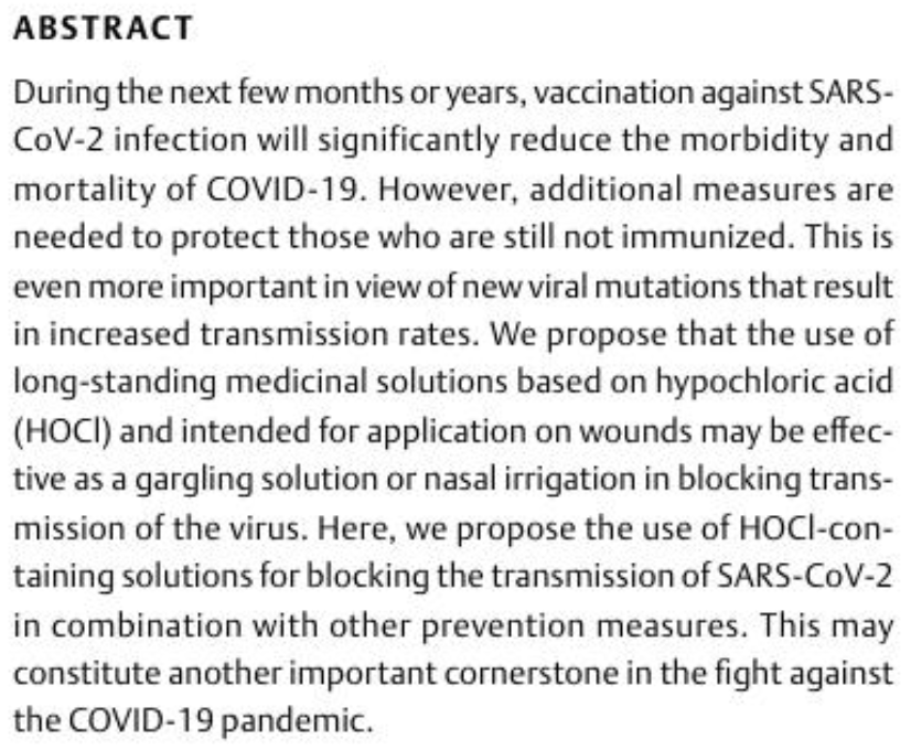 "abstract": "<jats:title>Abstract</jats:title><jats:p>During the next few months or years, vaccination against SARS-CoV-2 infection will significantly reduce the morbidity and mortality of COVID-19. However, additional measures are needed to protect those who are still not immunized. This is even more important in view of new viral mutations that result in increased transmission rates. We propose that the use of long-standing medicinal solutions based on hypochloric acid (HOCl) and intended for application on wounds may be effective as a gargling solution or nasal irrigation in blocking transmission of the virus. Here, we propose the use of HOCl-containing solutions for blocking the transmission of SARS-CoV-2 in combination with other prevention measures. This may constitute another important cornerstone in the fight against the COVID-19 pandemic.</jats:p>",