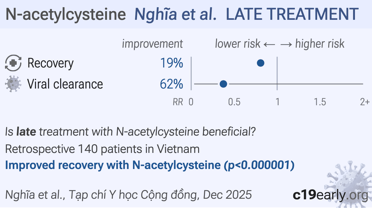 Retrospective 140 mild to moderate COVID-19 outpatients showing shorter treatment duration and improved symptom resolution with the addition of N-acetylcysteine and respiratory rehabilitation versus molnupiravir alone. The combination group (n=80) had mean treatment duration of 7.56±1.40 days versus 9.36±2.15 days for molnupiravir monotherapy (n=60, p<0.05).