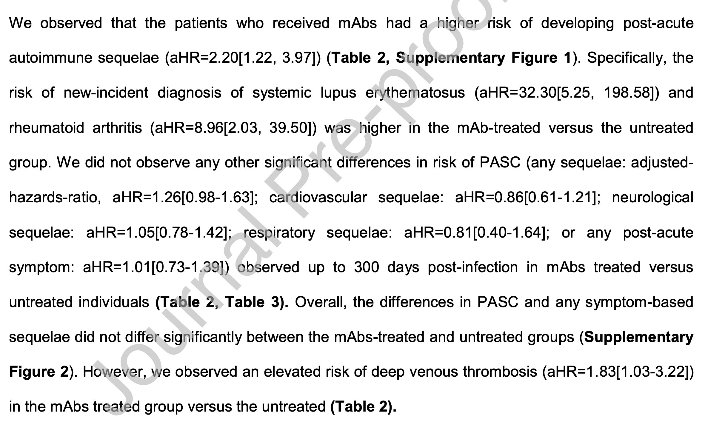 Results Of 19,689 eligible hospitalised individuals, 6.9% received early mAb therapy. While mAb treatment had no significant impact on overall post-acute sequelae (aHR for any sequelae:1.26[0.98-1.63]), we observed an increased risk of autoimmune ), particularly systemic lupus erythematosus and rheumatoid arthritis). There was also elevated risk of deep venous thrombosis (aHR=1. 83[1.03-3.22]), but this was no longer significant after adjusting for prior healthcare utilisation.