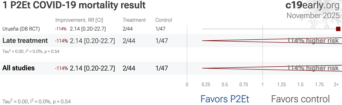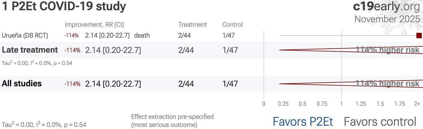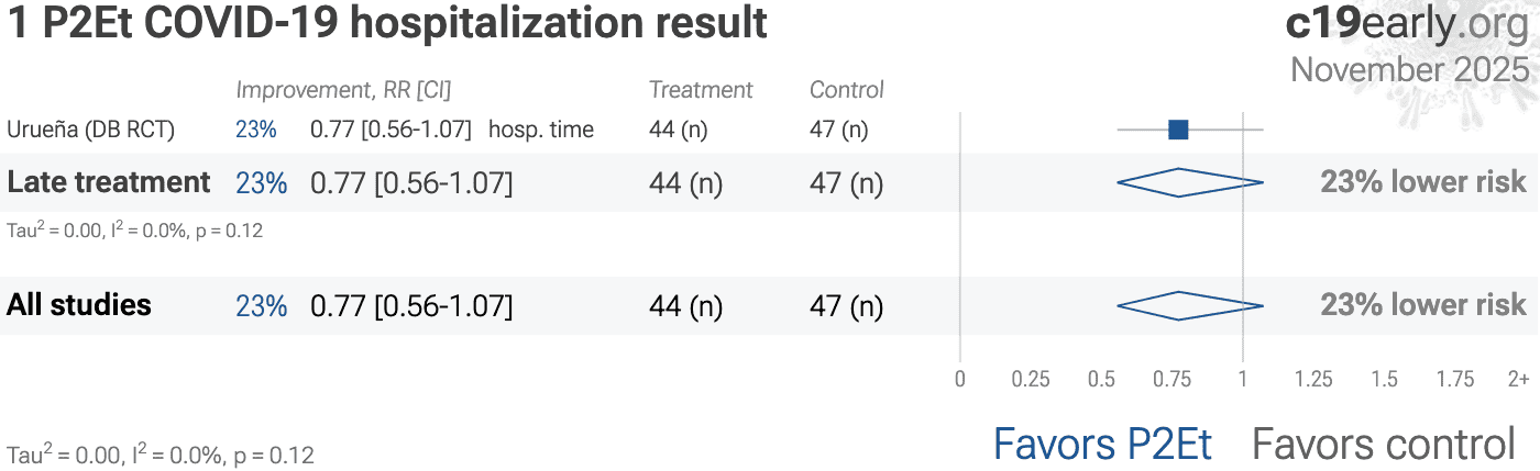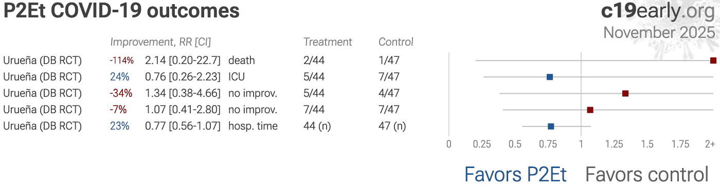 | 24% lower ICU admission (p=0.76) and 23% shorter hospitalization (p=0.12). RCT 91 hospitalized COVID-19 patients in Colombia showing no significant differences in clinical outcomes with P2Et treatment. P2Et treatment was associated with reduced pro-inflammatory cytokines (G-CSF, IL-5, IL-18) and increased NK cel.. | ||