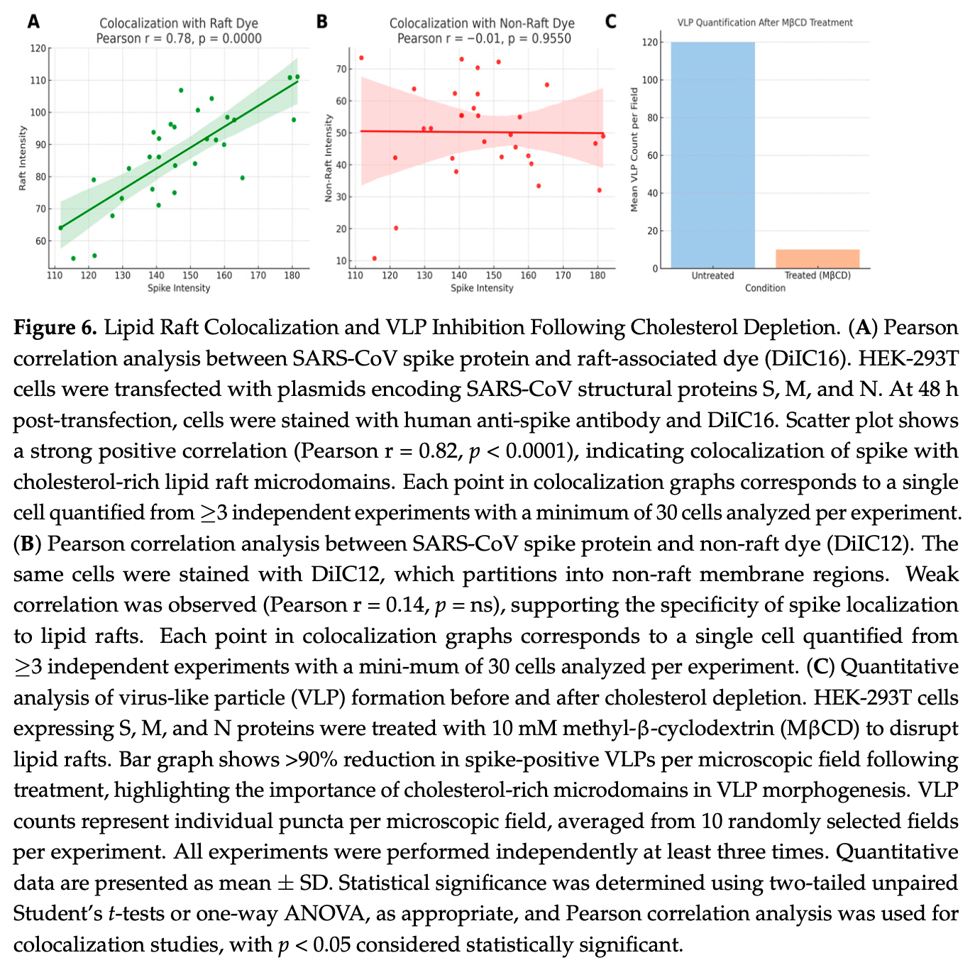 "abstract": "<jats:p>Severe acute respiratory syndrome coronavirus (SARS-CoV) assembles and buds from the Golgi apparatus or the ER membrane, but the specific membrane microdomains utilized during this process remain underexplored. Here, we show that co-expression of the SARS-CoV structural proteins S, M, and N in HEK-293T cells is sufficient to generate genome-free SARS-CoV-like virus-like particles (VLPs), which preferentially bud from glycolipid-enriched membrane lipid raft microdomains. Immunofluorescence microscopy using raft-selective dyes (DiIC16) and spike-specific antibodies revealed strong co-localization of VLPs with lipid rafts. Detergent-resistant membrane analysis and sucrose gradient centrifugation further confirmed the presence of S protein in buoyant, raft-associated fractions alongside the raft marker CD44. Importantly, pharmacological disruption of rafts with methyl-β-cyclodextrin reduced VLP budding and S protein partitioning into raft domains, underscoring the requirement for intact lipid rafts in assembly. Additionally, our data support lipid raft-associated proteins’ (e.g., FNRA, VIM, CD59, RHOA) roles in modulating cellular responses conducive to viral replication and assembly. These findings highlight lipid rafts as crucial platforms for SARS-CoV morphogenesis and suggest new avenues for vaccine and antiviral development using VLPs and raft-targeting therapeutics.</jats:p>",