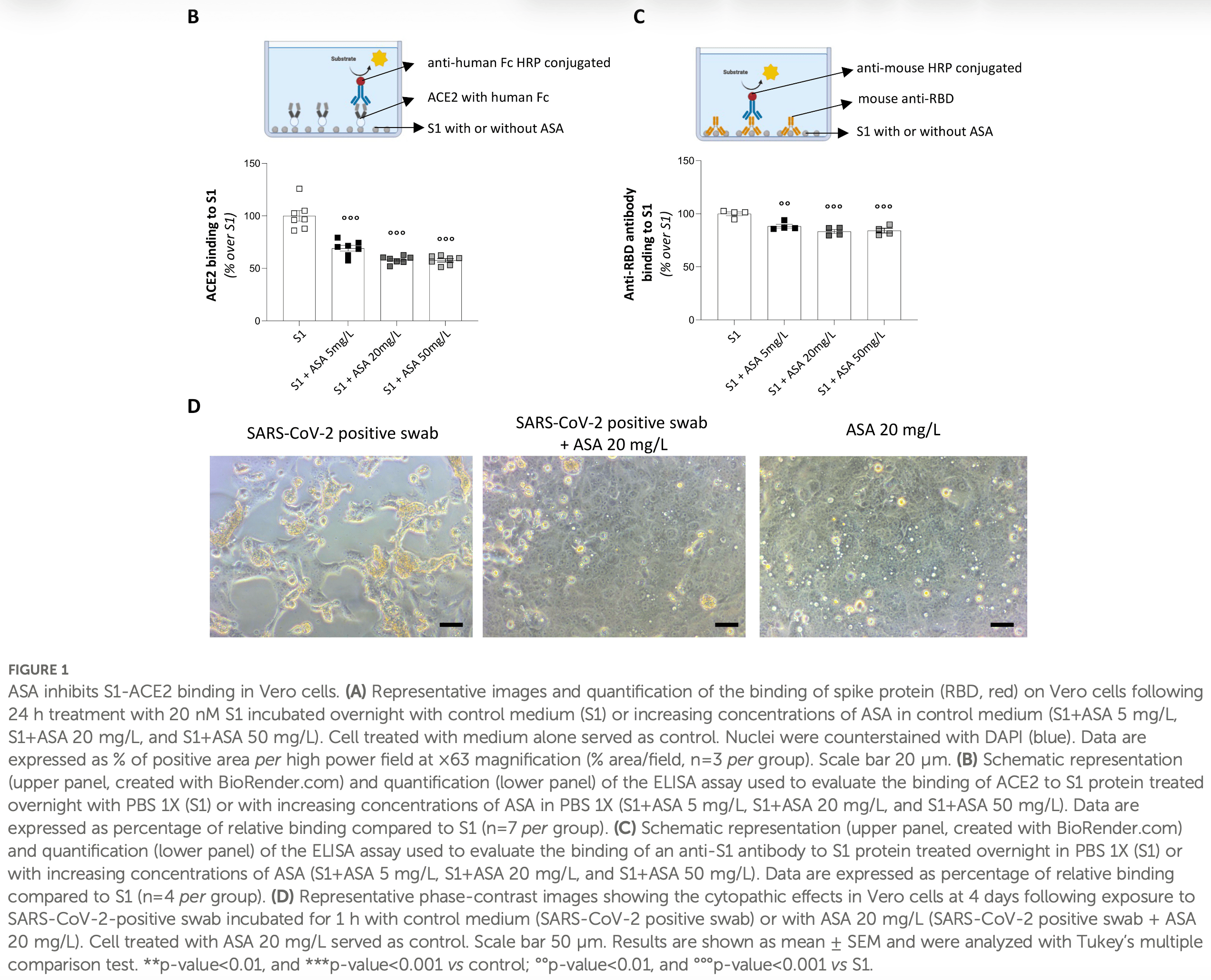 In vitro and mouse study showing that acetylsalicylic acid (ASA/aspirin) inhibits SARS-CoV-2 spike protein S1 subunit binding to ACE2 in a dose-dependent manner.
