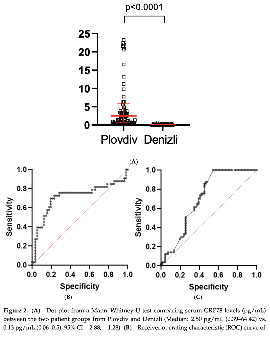 "abstract": "<jats:p>COVID-19 pneumonia remains a major driver of morbidity and mortality worldwide, with outcomes influenced by demographic, clinical, and systemic factors. Glucose-regulated protein 78 (GRP78) has emerged as a potential biomarker of disease severity, but its clinical significance across different populations remains underexplored. We conducted a retrospective cohort study including 83 hospitalized COVID-19 patients from General Hospital “Sv. Georgi”, Plovdiv, Bulgaria, and 97 from Denizli, Türkiye. Pneumonia diagnosis was based on clinical, laboratory, and radiological criteria. Patient demographics and biomarkers (CRP, D-dimer, oxygen saturation, lymphocyte count, and serum GRP78) were compared between cohorts. Statistical analyses included Mann–Whitney U, t-tests, and logistic regression. Pneumonia prevalence was 48.8% in patients from General Hospital “Sv. Georgi”, Plovdiv and 58.8% in Denizli. Patients in Plovdiv were older and exhibited higher CRP, D-dimer, and GRP78 levels, alongside lower oxygen saturation and lymphocyte counts. Logistic regression demonstrated that GRP78 significantly predicted pneumonia in both cohorts, with robust discriminative performance on ROC analysis. This study highlights significant regional differences in COVID-19 pneumonia presentation between Bulgaria and Türkiye. Elevated GRP78 levels were strongly associated with pneumonia and other severity markers, underscoring its potential as a clinically valuable biomarker for early risk stratification. These findings emphasize the importance of both localized epidemiological analyses and biomarker-based approaches to optimize COVID-19 management.</jats:p>",