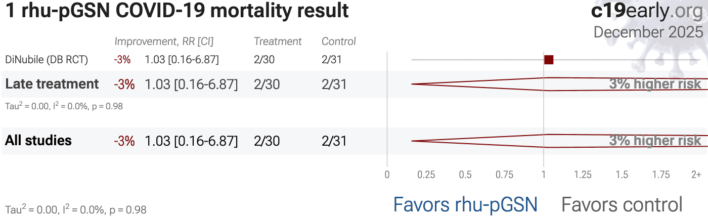 | 3% higher mortality (p=1), 48% lower ventilation (p=0.47), and 29% higher progression (p=0.73). RCT 61 hospitalized patients with COVID-19 pneumonia showing no significant difference in survival without major organ support with recombinant human plasma gelsolin (rhu-pGSN). This double-blind, placebo-controlled trial evaluated rhu-pG.. | ||