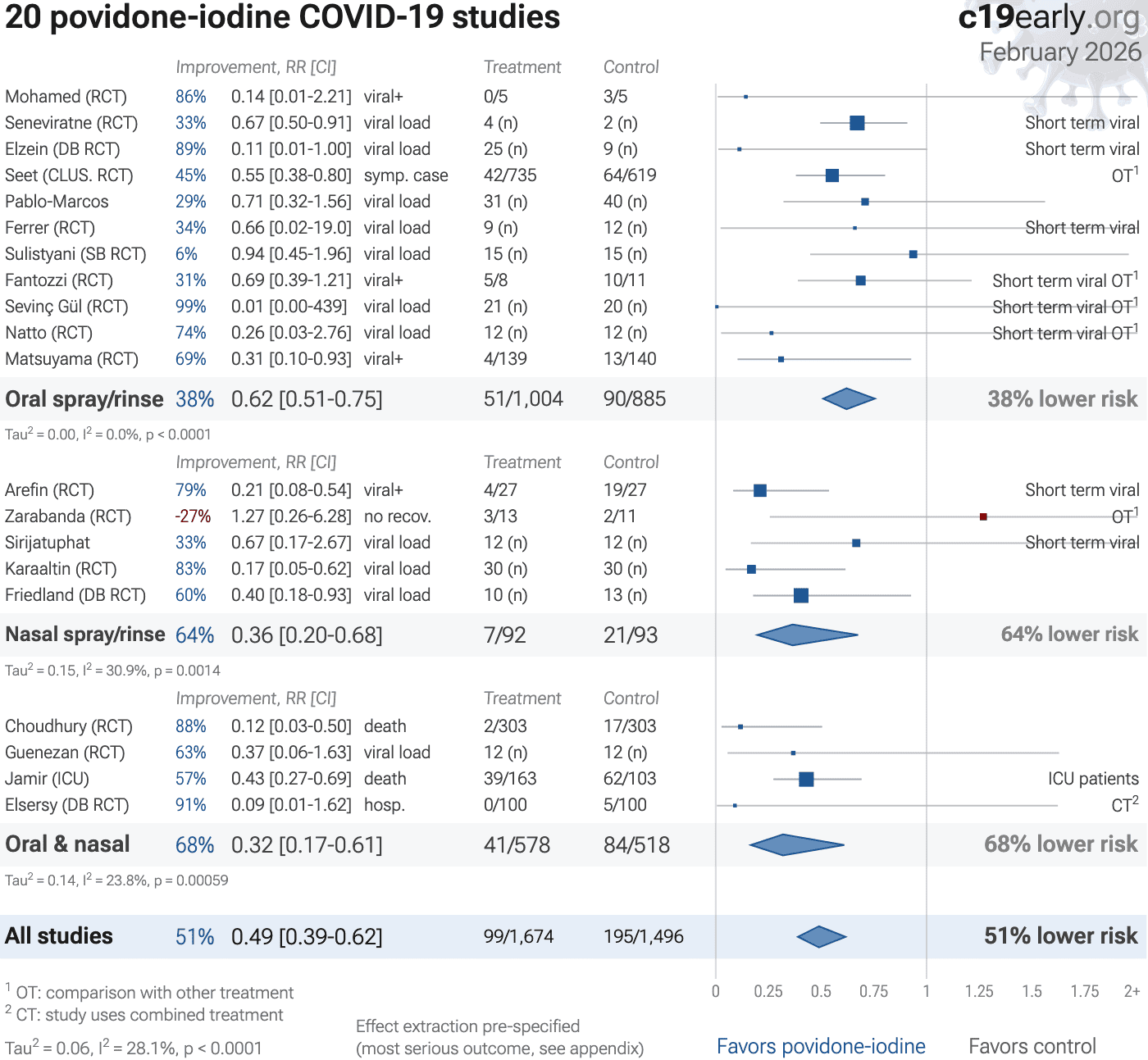 0 0.25 0.5 0.75 1 1.25 1.5 1.75 2+ Mohamed (RCT) 86% 0.14 [0.01-2.21] viral+ 0/5 3/5 Improvement, RR [CI] Treatment Control Choudhury (RCT) 88% 0.12 [0.03-0.50] death 2/303 17/303 Guenezan (RCT) 63% 0.37 [0.06-1.63] viral load 12 (n) 12 (n) Elzein (DB RCT) 89% 0.11 [0.01-1.00] viral load 25 (n) 9 (n) Short term viral Arefin (RCT) 79% 0.21 [0.08-0.54] viral+ 4/27 19/27 Short term viral Pablo-Marcos 29% 0.71 [0.32-1.56] viral load 31 (n) 40 (n) Sulistyani (SB RCT) 6% 0.94 [0.45-1.96] viral load 15 (n) 15 (n) Elsersy (DB RCT) 91% 0.09 [0.01-1.62] hosp. 0/100 5/100 CT​2 Sevinç Gül (RCT) 99% 0.01 [0.00-439] viral load 21 (n) 20 (n) Short term viral OT​1 Natto (RCT) 74% 0.26 [0.03-2.76] viral load 12 (n) 12 (n) Short term viral OT​1 Sirijatuphat 33% 0.67 [0.17-2.67] viral load 12 (n) 12 (n) Short term viral Karaaltin (RCT) 83% 0.17 [0.05-0.62] viral load 30 (n) 30 (n) Matsuyama (RCT) 69% 0.31 [0.10-0.93] viral+ 4/139 13/140 Friedland (DB RCT) 60% 0.40 [0.18-0.93] viral load 10 (n) 13 (n) Sulistyani 44% 0.56 [0.40-0.79] viral load 15 (n) 15 (n) Tau​2 = 0.11, I​2 = 28.7%, p < 0.0001 Early treatment 60% 0.40 [0.29-0.57] 10/757 57/753 60% lower risk Seneviratne (RCT) 33% 0.67 [0.50-0.91] viral load 4 (n) 2 (n) Short term viral Improvement, RR [CI] Treatment Control Zarabanda (RCT) -27% 1.27 [0.26-6.28] no recov. 3/13 2/11 OT​1 Jamir (ICU) 57% 0.43 [0.27-0.69] death 39/163 62/103 ICU patients Ferrer (RCT) 34% 0.66 [0.02-19.0] viral load 9 (n) 12 (n) Short term viral Fantozzi (RCT) 31% 0.69 [0.39-1.21] viral+ 5/8 10/11 Short term viral OT​1 Graves (DB RCT) 85% 0.15 [0.00-454] viral load 16 (n) 16 (n) Short term viral Tau​2 = 0.01, I​2 = 11.7%, p < 0.0001 Late treatment 43% 0.57 [0.45-0.73] 47/213 74/155 43% lower risk Seet (CLUS. RCT) 45% 0.55 [0.38-0.80] symp. case 42/735 64/619 OT​1 Improvement, RR [CI] Treatment Control Tau​2 = 0.00, I​2 = 0.0%, p = 0.002 Prophylaxis 45% 0.55 [0.38-0.80] 42/735 64/619 45% lower risk All studies 49% 0.51 [0.42-0.62] 99/1,705 195/1,527 49% lower risk 22 povidone-iodine COVID-19 studies c19early.org February 2026 Tau​2 = 0.04, I​2 = 21.4%, p < 0.0001 Effect extraction pre-specified(most serious outcome, see appendix) 1 OT: comparison with other treatment2 CT: study uses combined treatment Favors povidone-iodine Favors control