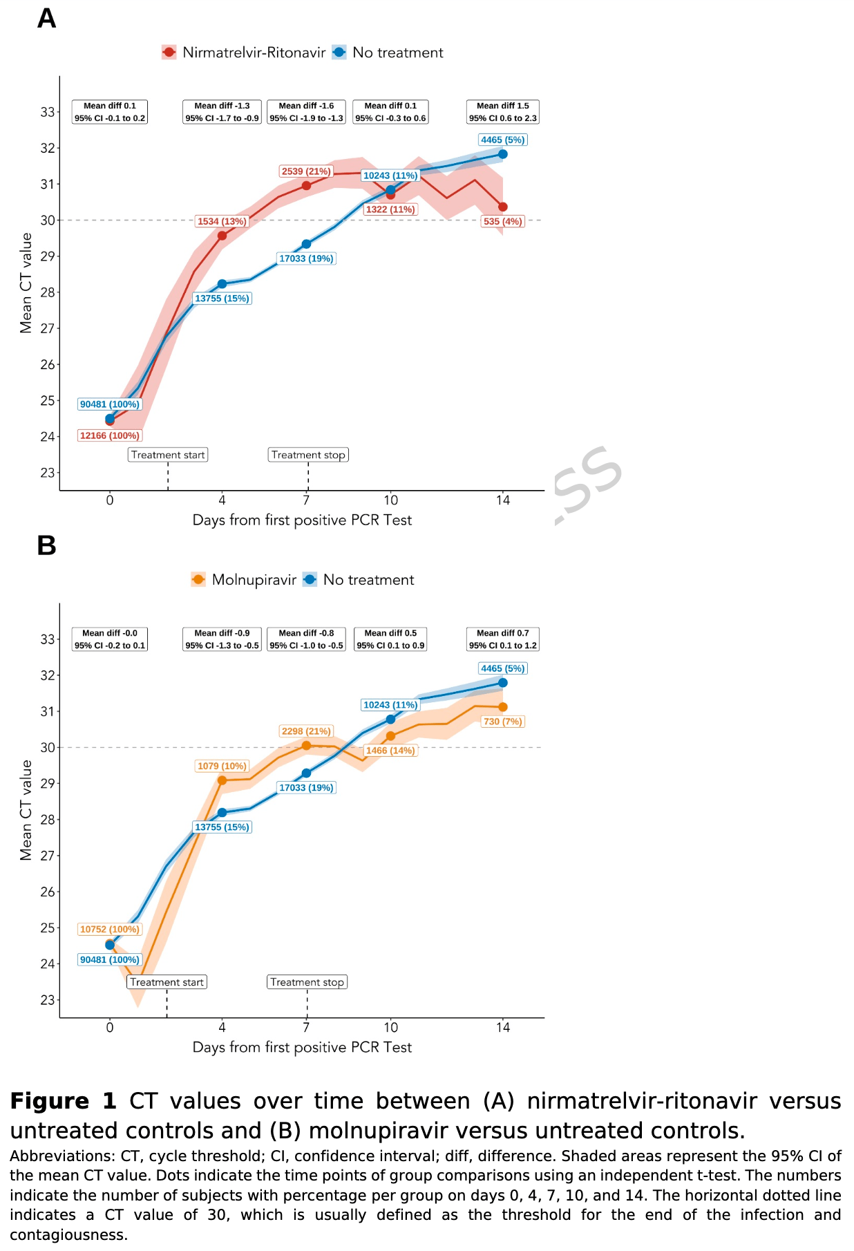Observational cohort study of 113,399 COVID-19 outpatients in Vienna showing viral kinetics patterns with nirmatrelvir-ritonavir and molnupiravir treatment. Both antivirals showed improved viral clearance at 7 days, but worse viral clearance at 14 days, suggesting viral rebound.