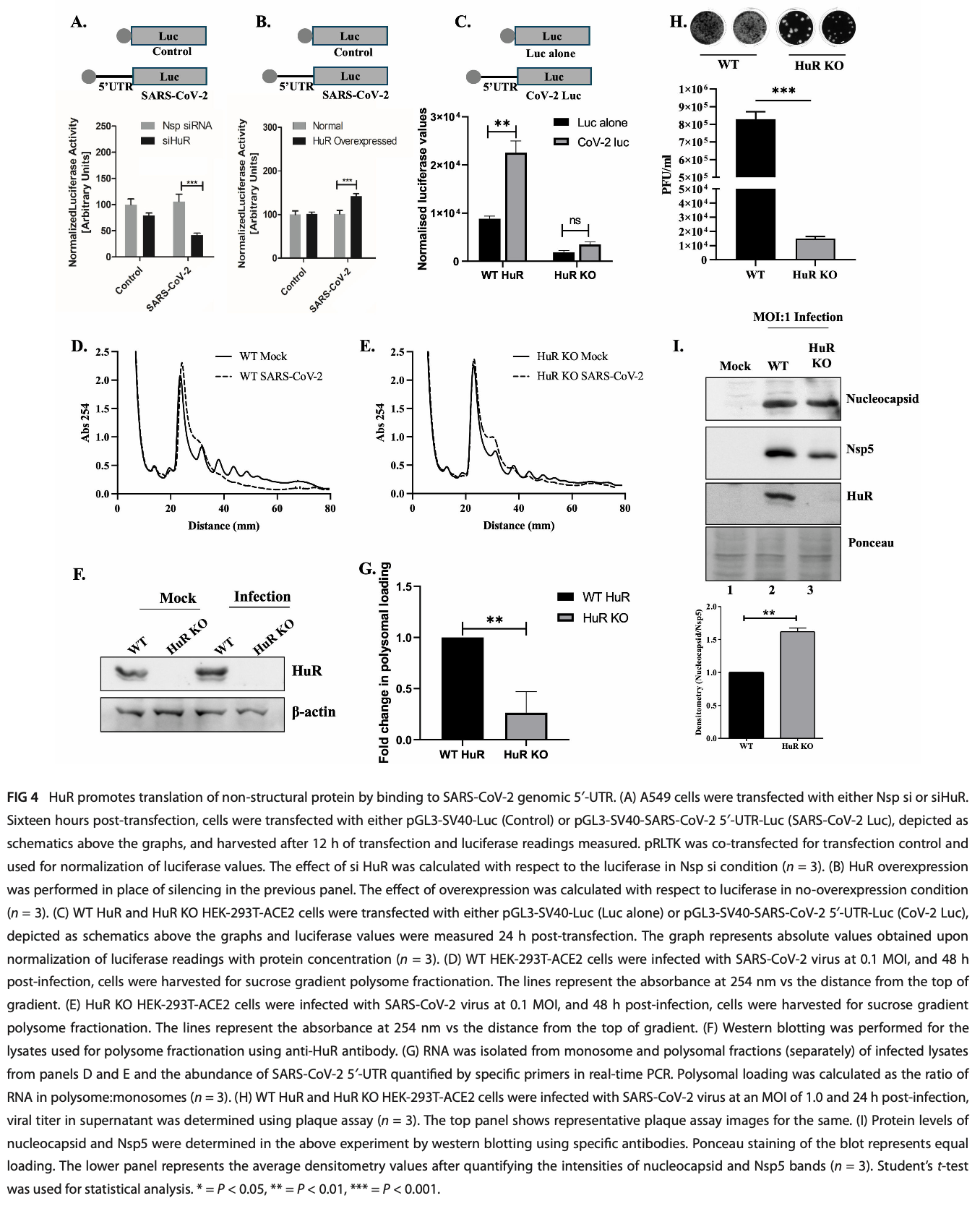 In vitro study showing that human antigen R (HuR), an RNA-binding protein, promotes SARS-CoV-2 replication by enhancing non-structural protein translation through the viral genomic 5′-UTR in HEK-293T-ACE2 and A549 cells.