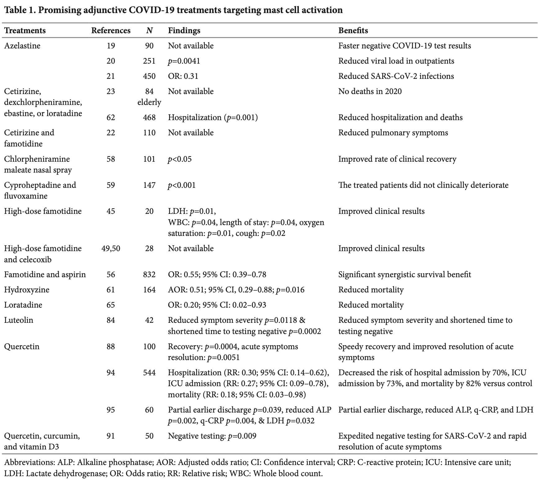 "abstract": "<jats:p>With the rollout of multiple COVID-19 vaccines, adjunctive treatments for COVID-19 have received less attention. Breakthrough infections post-vaccination (including boosters) underscore the need to continue evaluating repurposed drugs and nutraceuticals as candidate adjunctive treatments. Early clinical studies of antihistamines hypothesized that targeting mast cells (and/or histamine receptors) might benefit COVID-19 patients. In cultured human coronary artery endothelial cells, histamine potentiated spike-mediated angiotensin-converting enzyme 2 internalization; this effect can be blocked by the antihistamine famotidine. This literature review focuses on clinical studies of antihistamines, mast cell stabilizers, and leukotriene receptor antagonists for COVID-19 patients. Several antihistamines and mast cell-targeting agents, including fluvoxamine, cyproheptadine, hydroxyzine, and antihistamines used alone or with azithromycin (dexchlorpheniramine, cetirizine, loratadine, and ebastine), as well as azelastine, famotidine (standard or high-dose), high-dose famotidine with celecoxib, and the flavonoid mast cell stabilizer quercetin, have been reported to be associated with clinical benefits in COVID-19 patients. Multiple studies have reported mixed results for aspirin, montelukast, and normal-dose famotidine; patients taking aspirin often have associated COVID-19 risk factors. In the context of current standard-of-care treatments, clinical studies evaluating candidate adjunctive treatments should carefully consider and avoid known drug&ndash;drug interactions, such as those involving celecoxib and dexamethasone. Further clinical studies of the identified treatments targeting mast cells and/or histamine receptors in COVID-19 patients associated with clinical benefits are therefore strongly recommended.</jats:p>",