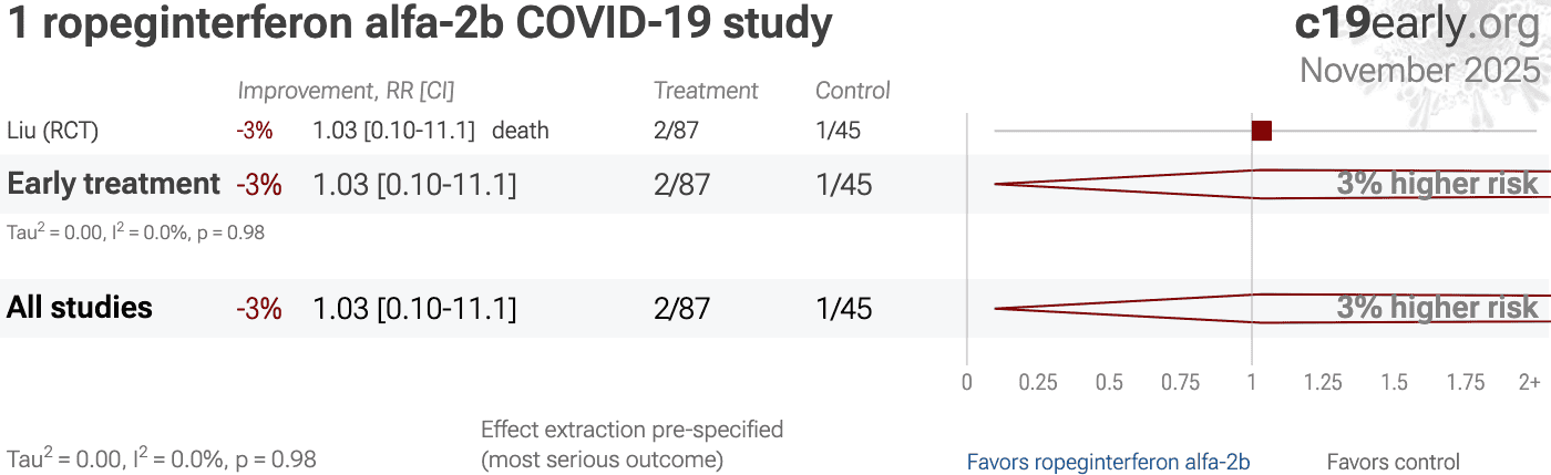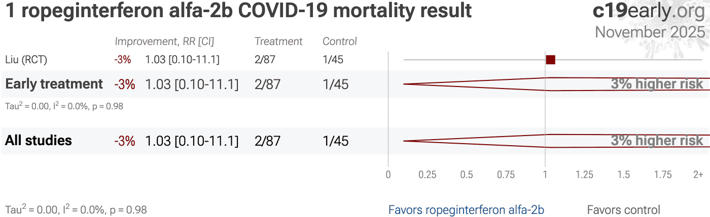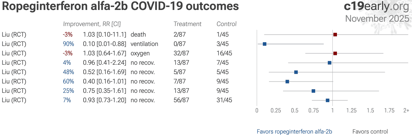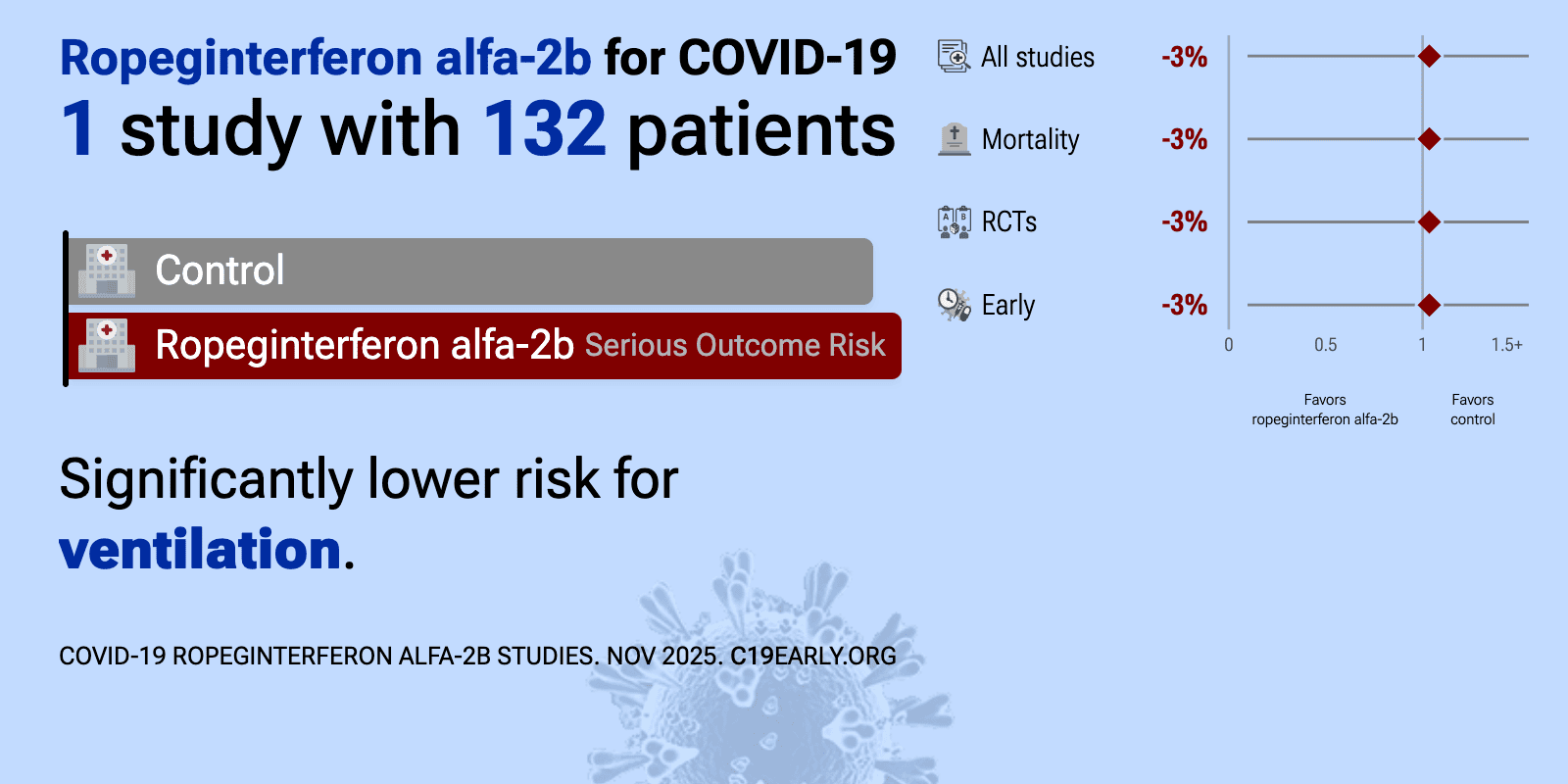| 90% lower ventilation (p=0.04), 3% higher need for oxygen therapy (p=1), and 4% improved recovery (p=1). RCT 132 hospitalized moderate COVID-19 patients in Taiwan showing higher rates of viral clearance or discharge by day 11 with ropeginterferon alfa-2b. The ropeginterferon alfa-2b group also showed higher rates of improvement in lung infil.. | ||