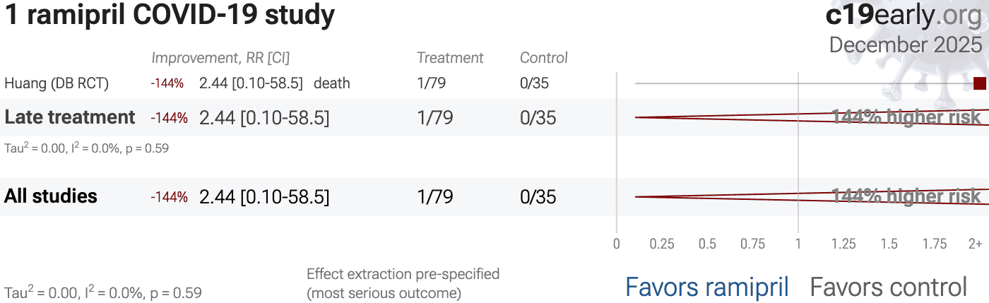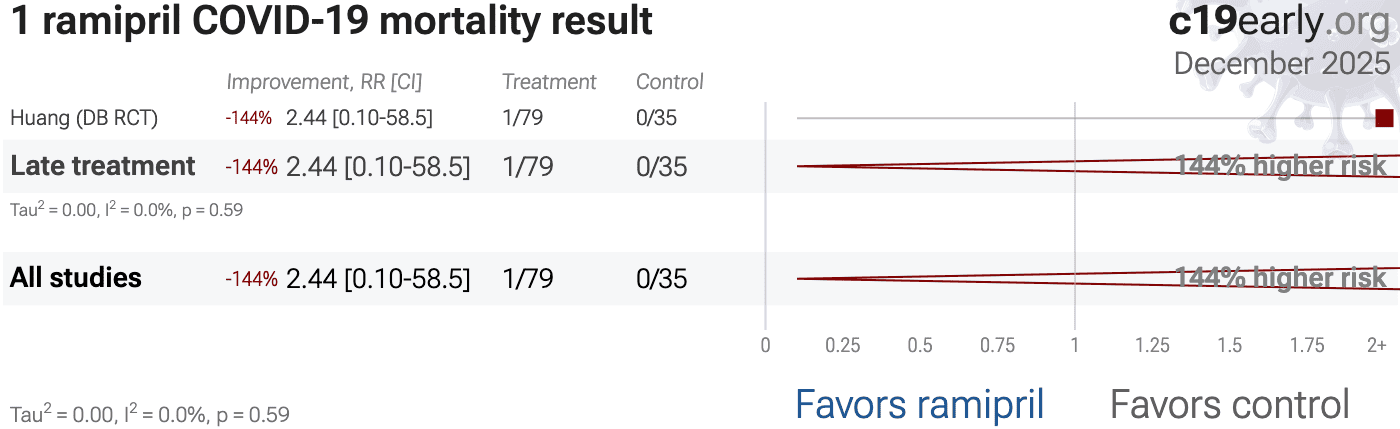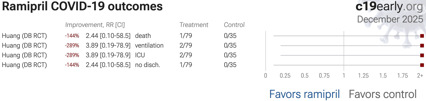 | 144% higher mortality (p=1), 289% higher ventilation (p=1), 289% higher ICU admission (p=1), and 144% lower hospital discharge (p=1). RCT 114 non-critically ill COVID-19 patients in the USA showing no significant differences with ramipril treatment. | ||