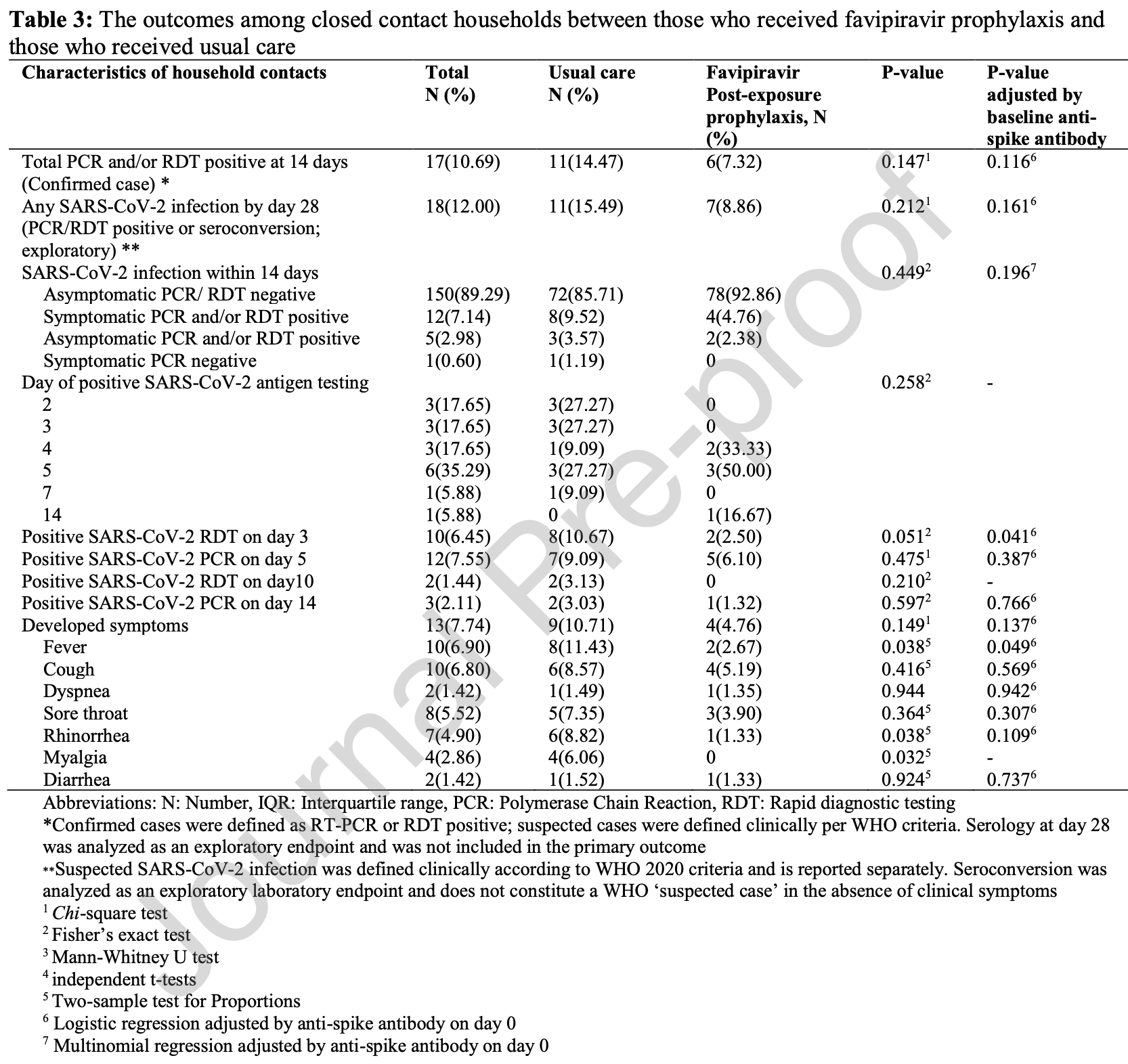 RCT 168 household close contacts showing no significant difference in SARS-CoV-2 infection with favipiravir post-exposure prophylaxis. The primary endpoint of laboratory-confirmed infection by day 14 occurred in 7.3% of the favipiravir group versus 14.5% of usual care (p=0.147).
