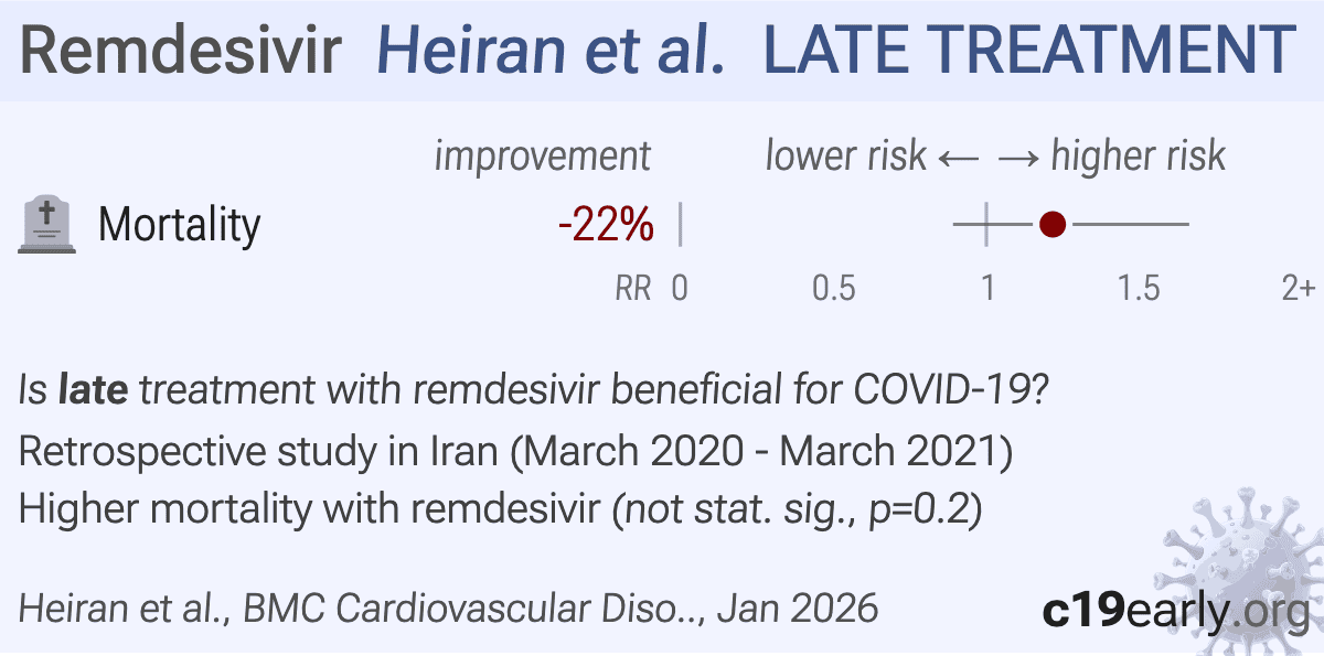0 0.25 0.5 0.75 1 1.25 1.5 1.75 2+ Madan (ES) 66% 0.34 [0.12-0.96] death 4/112 27/260 Improvement, RR [CI] Treatment Control PINETREE Gottlieb (DB RCT) 87% 0.13 [0.03-0.59] death/hosp. 2/279 15/283 Killingley -60% 1.60 [0.51-5.03] progression 6 (n) 12 (n) Piccicacco 66% 0.34 [0.01-8.32] death 0/82 1/90 Kneidinger 20% 0.80 [0.35-1.82] severe case 6/46 28/172 Ong -75% 1.75 [0.23-13.0] recov. time 4 (n) 14 (n) Chew -68% 1.68 [0.51-5.58] progression 12 (n) 151 (n) PLATCOV Jittamala (RCT) 66% 0.34 [0.01-8.12] hosp. 0/67 1/69 Seah -129% 2.29 [0.26-20.1] no recov. 2/7 1/8 Choi -267% 3.67 [0.20-3.27] death 308 (n) 13,656 (n) Siami -70% 1.70 [0.76-3.82] hosp. 341 (n) 148 (n) Tau​2 = 0.43, I​2 = 50.0%, p = 0.95 Early treatment 2% 0.98 [0.55-1.75] 14/1,264 73/14,863 2% lower risk Wang (RCT) -9% 1.09 [0.54-2.18] death 22/158 10/78 Improvement, RR [CI] Treatment Control Olender 59% 0.41 [0.24-0.71] death 24/312 102/818 Spinner (RCT) 35% 0.65 [0.18-2.40] death 5/384 4/200 Pasquini (ICU) 16% 0.84 [0.69-0.94] death 14/25 24/26 ICU patients Fried 61% 0.39 [0.15-0.99] death 4/48 2,510/11,673 ACTT-1 Beigel (RCT) 27% 0.73 [0.52-1.03] death 541 (n) 521 (n) SOLIDARITY SOLIDARITY .. (RCT) 5% 0.95 [0.81-1.11] death 301/2,743 303/2,708 El-Solh 29% 0.71 [0.52-0.97] death 63/219 202/424 SARSTer Flisiak 49% 0.51 [0.19-1.30] death 5/122 17/211 Garibaldi 20% 0.80 [0.46-1.41] death 23/303 45/303 Ullah -100% 2.00 [0.67-5.94] death 8/30 4/30 Yeramaneni -24% 1.24 [0.11-14.2] death 32 (n) 7,126 (n) Goldberg 9% 0.91 [0.50-1.67] hosp. time 29 (n) 113 (n) Tsuzuki -4% 1.04 [0.98-1.09] death 69/824 285/11,663 Mahajan (RCT) -76% 1.76 [0.46-6.82] death 5/34 3/36 Mulhem -86% 1.86 [0.21-5.24] death 1/8 515/3,211 Haji Aghajani 19% 0.81 [0.46-1.46] death 46 (n) 945 (n) Elhadi (ICU) -11% 1.11 [0.81-1.51] death 14/21 267/444 ICU patients Pourhoseingholi -2% 1.02 [0.72-1.44] death 42/123 297/2,345 Arch (PSM) 20% 0.80 [0.64-0.98] death 203/1,491 777/4,676 NOR-Solidarity Barrat-Due (DB RCT) 0% 1.00 [0.20-4.60] death 3/42 4/57 Ohl (PSM) -6% 1.06 [0.83-1.36] death 143/1,172 124/1,172 Madan 44% 0.56 [0.33-0.95] death 23/398 27/260 Kuno (PSM) 1% 0.99 [0.84-1.17] death 214/999 216/999 Elavarasi -137% 2.37 [1.98-2.83] death 146/403 207/1,352 Diaz 35% 0.65 [0.46-0.92] death 33/286 173/852 DISCOVERY Ader (RCT) 6% 0.94 [0.59-1.45] death 34/414 37/418 Mozaffari 12% 0.88 [0.81-0.96] death 4,441/28,855 5,499/28,855 Sarhan (RCT) -35% 1.35 [0.70-2.60] death 15/52 12/56 OT​1 Schmidt (PSM) -509% 6.09 [2.71-13.7] severe case 43 (n) 434 (n) Jamir (ICU) 8% 0.92 [0.55-1.55] death 60/181 41/85 ICU patients Mustafa 33% 0.67 [0.38-1.20] death 16/200 29/244 CATCO Ali (RCT) 12% 0.88 [0.72-1.07] death 127/634 152/647 Kurniyanto -460% 5.60 [2.32-13.5] death 7/45 12/432 Siraj 53% 0.47 [0.35-0.62] death 108/413 197/587 Salehi (ICU) 37% 0.63 [0.43-0.94] death 17/40 57/85 ICU patients Elec 19% 0.81 [0.38-1.69] death 7/38 29/127 Zangeneh (ICU) 32% 0.68 [0.45-1.01] death n/a n/a ICU patients Malundo -17% 1.17 [0.80-1.70] death 24/115 197/1,100 Bowen -57% 1.57 [1.25-1.97] death 817 (n) 3,814 (n) Raad 42% 0.58 [0.39-0.88] death n/a n/a Oku -40% 1.40 [0.41-4.36] death 3/46 8/172 Behboodikhah 38% 0.62 [0.30-1.30] death 1,214 (n) 960 (n) Cacho -80% 1.80 [0.37-8.82] death 5/57 2/41 Hartantri 11% 0.89 [0.31-2.53] death n/a n/a Alshamrani (PSM) 17% 0.83 [0.72-0.93] death 137/246 725/1,078 Mitsushima -44% 1.44 [1.09-1.90] death n/a n/a Punzalan -42% 1.42 [0.92-2.20] death 47/224 26/176 Kim -1612% 17.12 [0.19-1565] death 14/145 0/22 Aweimer -13% 1.13 [0.93-1.37] death 40/51 68/98 Intubated patients Arfijanto 1% 0.99 [0.64-1.53] viral+ 17/44 46/118 Bavaro (PSW) 7% 0.93 [0.89-0.97] severe case 120 (n) 211 (n) Shamsi -23% 1.23 [0.56-2.69] death 8/53 16/130 Mozaffari (PSM) 25% 0.75 [0.68-0.83] death 14,169 (n) 5,341 (n) Nadeem -12% 1.12 [0.39-3.26] death 12/96 4/36 Burhan (ICU) -15% 1.15 [0.96-1.37] death 33/43 345/516 ICU patients Hagman 0% 1.00 [0.60-1.80] death 105 (n) 213 (n) Ho -62% 1.62 [1.35-1.95] death 5,294 (n) 21,151 (n) Amirizadeh (ICU) -3% 1.03 [0.86-1.24] death 31/35 30/35 ICU patients Muntean -45% 1.45 [1.04-2.03] death 71/287 45/264 Chang -185% 2.85 [1.03-7.85] death 81 (n) 81 (n) Alsaraj (RCT) -83% 1.83 [0.66-5.11] death 9/52 5/53 Liao -25% 1.25 [0.55-2.86] death 37/59 3/6 Sokolski 0% 1.00 [0.67-1.47] death 88 (n) 460 (n) Lewandowski -21% 1.21 [0.66-2.22] death 430 (all patients) Drouin -46% 1.46 [1.15-1.54] severe case 52/102 135/354 Milan -34% 1.34 [0.20-8.91] death 1/8 16/172 REDPINE Sise (DB RCT) -6% 1.06 [0.72-1.55] death 55/166 26/83 Anzalone (PSM) -33% 1.33 [1.29-1.37] death n/a n/a Kawther -9% 1.09 [0.46-2.57] death 111 (n) 340 (n) Angleitner -223% 3.23 [1.46-7.17] viral time 8 (n) 55 (n) Mohammed (PSM) 67% 0.33 [0.04-3.15] death 1/101 3/101 Floridia -23% 1.23 [0.78-1.95] PASC 318 (n) 1,216 (n) Heiran -22% 1.22 [0.89-1.66] death n/a n/a Tau​2 = 0.07, I​2 = 90.5%, p = 0.67 Late treatment -2% 1.02 [0.94-1.11] 6,794/65,963 13,881/122,610 2% higher risk All studies -2% 1.02 [0.94-1.11] 6,808/67,227 13,954/137,473 2% higher risk 84 remdesivir COVID-19 studies c19early.org February 2026 Tau​2 = 0.07, I​2 = 89.5%, p = 0.59 Effect extraction pre-specified(most serious outcome, see appendix) 1 OT: comparison with other treatment Favors remdesivir Favors control