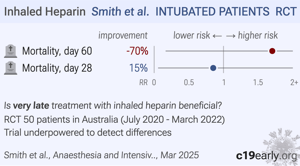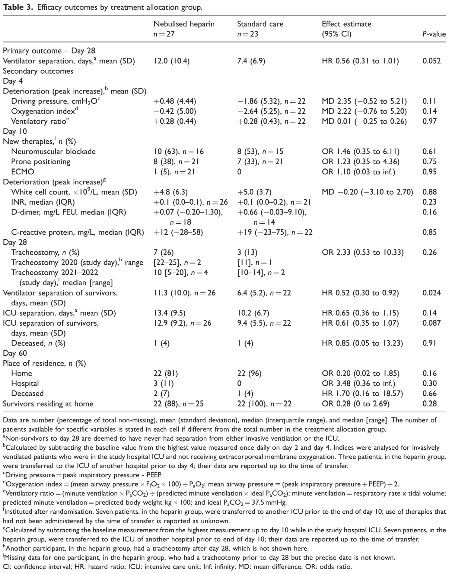 "abstract": "<jats:p>\n Nebulised unfractionated heparin (UFH) might reduce time to ventilator separation in patients with COVID-19 by reducing virus infectivity, pulmonary coagulopathy, and inflammation, but clinical trial data are limited. Between 1 July 2020 and 23 March 2022, we conducted, at two hospitals in Victoria, Australia, a randomised, parallel-group, open-label, controlled trial of nebulised UFH. Eligible patients were aged 18 years or more, intubated, under intensive care unit management, had a P\n <jats:sub>a</jats:sub>\n O\n <jats:sub>2</jats:sub>\n to F\n <jats:sub>I</jats:sub>\n O\n <jats:sub>2</jats:sub>\n ratio of 300 or less, had acute opacities affecting at least one lung quadrant and attributed to COVID-19, and were polymerase chain reaction-positive for SARS-CoV-2 or had further testing planned. The target sample size was 270, however, the trial was stopped due to slow recruitment. There were 50 enrolments, all of whom were analysed. The median age was 55 (interquartile range (IQR) 46–64) years, 28 (56%) were males, and 46 (92%) had acute respiratory distress syndrome. Twenty-seven (54%) were randomised to nebulised heparin and 23 (46%) to standard care. Nebulised UFH was administered to the heparin group on 6 (IQR 4–10) days; median daily dose of 83 (IQR 75–88) kIU. The primary outcome, time to separation from invasive ventilation to day 28 adjusted for the competing risk of death, was not significantly different between groups but took numerically longer in the nebulised heparin group (12.0, standard deviation (SD) 10.4 days versus 7.4, SD 6.9 days; hazard ratio (HR) 0.56, 95% confidence interval (CI) 0.31 to 1.01,\n <jats:italic>P</jats:italic>\n = 0.052). One patient died by day 28 in each group, fewer than expected. Time to separation from invasive ventilation among survivors to day 28 occurred more quickly than expected in the standard care group and was, without correction for multiple comparisons, significantly slower in the heparin group (11.3, SD 10.0 days,\n <jats:italic>n</jats:italic>\n = 26 versus 6.4, SD 5.2 days,\n <jats:italic>n</jats:italic>\n = 22; HR 0.52, 95% CI 0.30 to 0.92,\n <jats:italic>P</jats:italic>\n = 0.024). Nebulised heparin did not reduce time to ventilator separation in intubated adult patients with COVID-19. The study is limited by the small sample size and potential for sampling bias. Further study is required.\n </jats:p>",