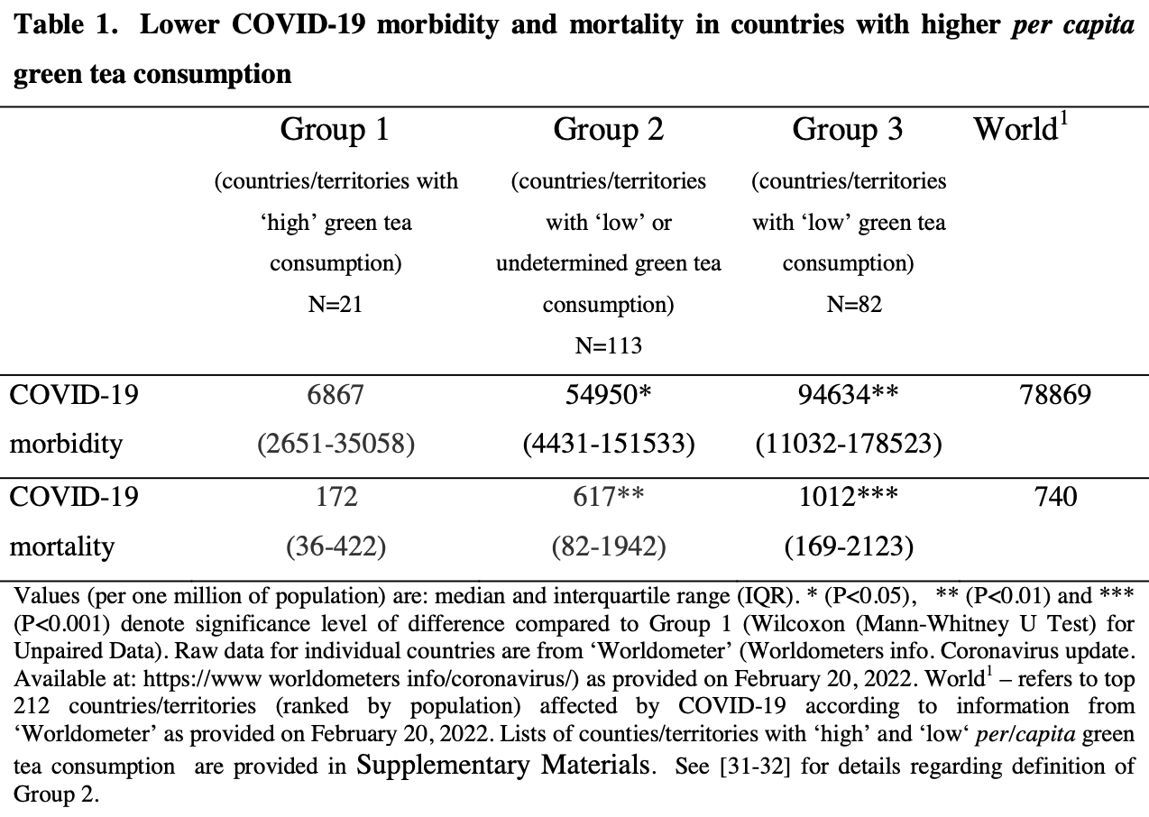 Ecological study comparing 134 countries/territories showing lower COVID-19 morbidity and mortality associated with higher per capita green tea consumption. The differences remained significant when excluding countries with low human development index (HDI). Statistically significant correlations between green tea consumption and reduced COVID-19 morbidity and mortality were found in regression models adjusting for confounders including population density, age, urbanization, and HDI. Author notes that the results are consistent with previous findings and in vitro evidence, but do not prove causality.