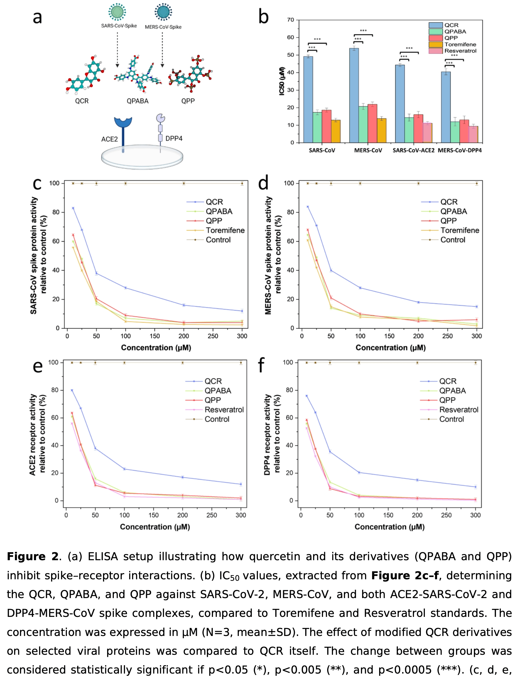 In vitro and in silico study showing that quercetin derivatives QPABA and QPP inhibit SARS-CoV-2 and MERS-CoV spike protein binding to host receptors. Authors synthesized quercetin para-aminobenzoic acid (QPABA) and quercetin penta-phosphate (QPP) derivatives with enhanced water solubility compared to native quercetin.