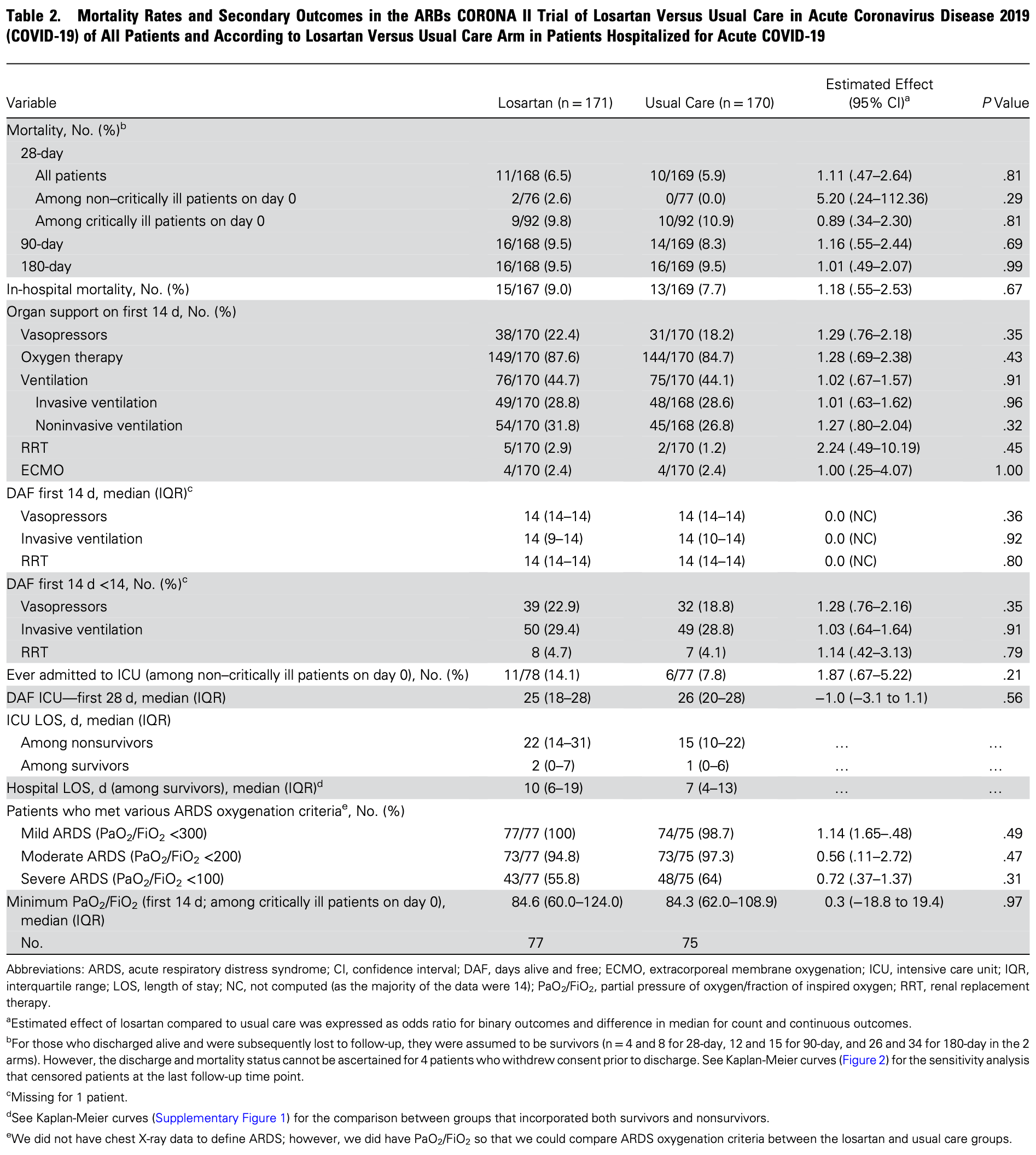 Puskarich, Ingraham, Merck, Efficacy of losartan in hospitalized patients with COVID-19-induced lung injury: a randomized clinical trial, JAMA Netw Open