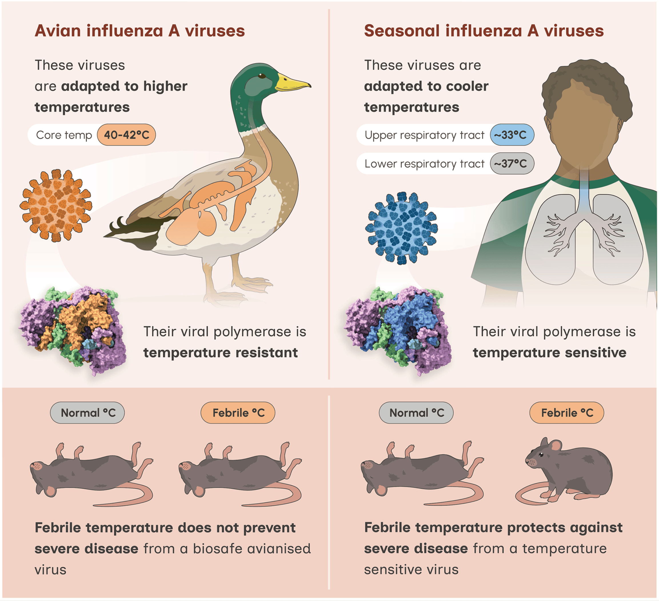 In vitro and mouse study showing the benefit of elevated body temperature against human-adapted influenza A viruses, and that avian-origin PB1 polymerase subunits overcome this natural defense. Authors found that the avian-origin PB1 protein enables viral replication at higher temperatures (40°C), a trait adapted from birds. In mice, simulating a fever by raising the ambient temperature successfully protected the animals from severe disease caused by a human-origin strain (PR8). However, an engineered virus with an avianized PB1 mutant bypassed this temperature-based immunity, causing severe disease despite the hyperthermic state. Authors suggest that this fever-resistant replication explains why certain pandemic strains that acquired avian-origin PB1 caused more severe disease in humans.