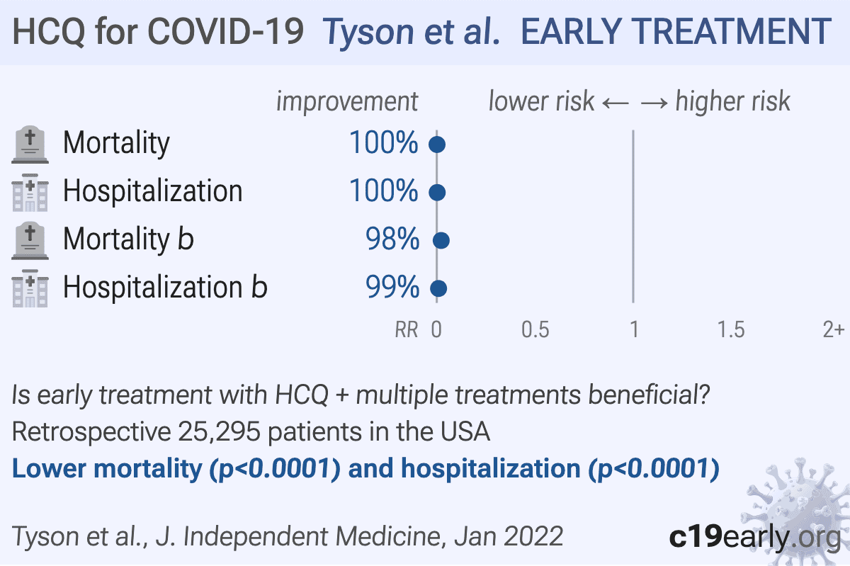 "abstract": "<jats:p>This study evaluates early ambulatory protocols for treating 4376 COVID-19 patients at All Valley Urgent Care (AVUC) facilities in Imperial County, California, and compares outcomes with other patients in the same region during a nearly identical period. The goal was to contribute to evidence on whether early outpatient treatment reduces hospitalization and mortality rates. The protocols, based on data from neighboring countries, included Protocol 1 (a multivitamin pack, selective use of hydroxychloroquine, two antibiotics, and inhaled steroids) and Protocol 2 (which added ivermectin). Results were stratified by disease severity at presentation. The average patient age was 40.5 years; 12.8% of patients were under 20 years old. For the 3962 mild COVID-19 patients treated early, no deaths occurred, compared to a 3.03% mortality rate (2.25% risk-adjusted) in the same county during the same period. Hospitalization rates for this group were 0.05%, compared to 22.68% (20.76% risk-adjusted) in the general population. When treated within 7 days, patients had a 100% success rate, while those treated later had a 99.9% success rate. Mild symptom patients had lower hospitalization (OR = 0.0293; P < .0001) and mortality (OR = 0.0000; P = .0008) rates. These results suggest the multidrug protocols significantly reduced adverse outcomes, with no serious side effects observed during follow-up (3–14 days).\n\nKeywords: COVID-19, hospitalization, hydroxychloroquine, ivermectin, mortality, multidrug, SARS-CoV-2</jats:p>",