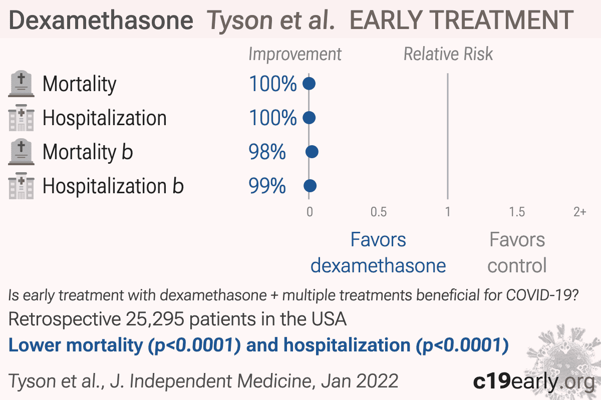 Mortality 100% Improvement Relative Risk Hospitalization 100% Mortality b 98% Hospitalization b 99% Dexamethasone  Tyson et al.  EARLY TREATMENT Is early treatment with dexamethasone + multiple treatments beneficial for COVID-19? Retrospective 25,295 patients in the USA Lower mortality (p<0.0001) and hospitalization (p<0.0001) c19early.org Tyson et al., J. Independent Medicine, Jan 2022 Favorsdexamethasone Favorscontrol 0 0.5 1 1.5 2+