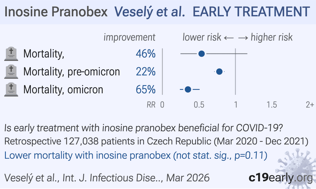Inosine pranobex was associated with a reduction in mortality in COVID-19 by over 22%, as reported in a retrospective study utilizing complete health data from the Czech national registry