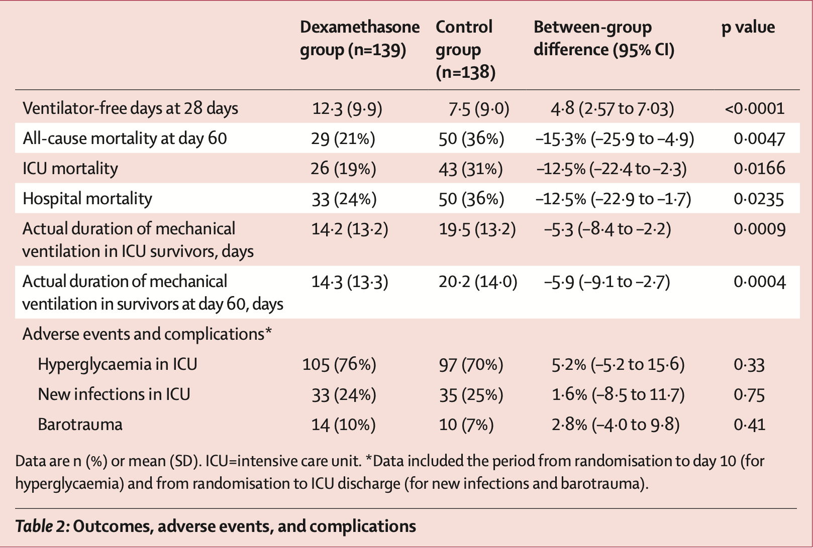 Findings Between March 28, 2013, and Dec 31, 2018, we enrolled 277 patients and randomly assigned 139 patients to the dexamethasone group and 138 to the control group. The trial was stopped by the data safety monitoring board due to low enrolment rate after enrolling more than 88% (277/314) of the planned sample size. The mean number of ventilator-free days was higher in the dexamethasone group than in the control group (between-group difference 4•8 days [95% CI 2•57 to 7•03]; p<0•0001). At 60 days, 29 (21%) patients in the dexamethasone group and 50 (36%) patients in the control group had died (between-group difference -15•3% [-25•9 to -4•9]; p=0•0047). The proportion of adverse events did not differ significantly between the dexamethasone group and control group. The most common adverse events were hyperglycaemia in the ICU (105 [76%] patients in the dexamethasone group vs 97 [70%] patients in the control group), new infections in the ICU (eg, pneumonia or sepsis; 33 [24%] vs 35 [25%]), and barotrauma (14 [10%] vs 10 [7%]). Interpretation Early..
