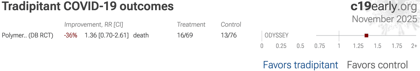 | 36% higher mortality (p=0.41) and no change in improvement. RCT 145 severe/critical COVID-19 patients in the USA, showing no significant difference with tradipitant treatment. | ||