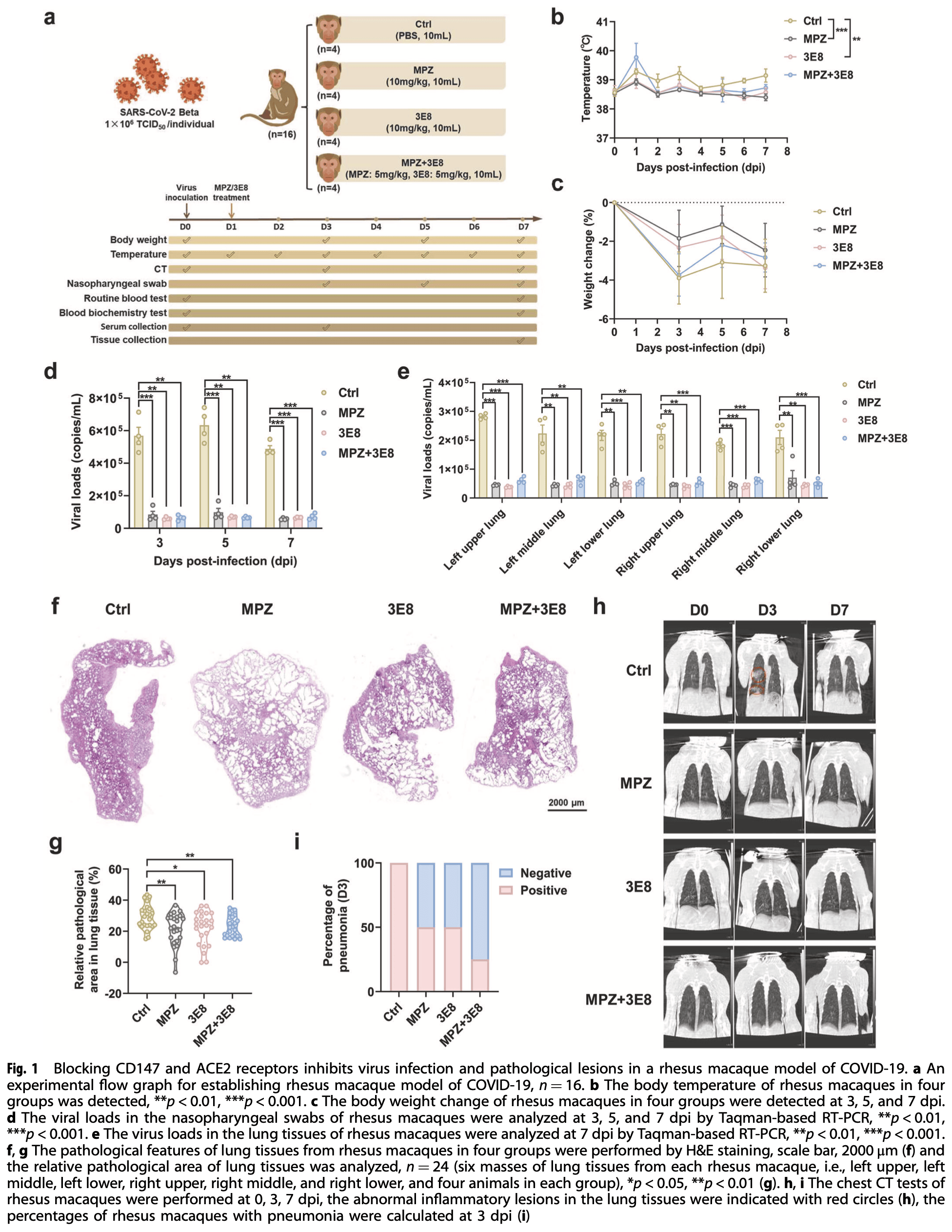 Animal study showing that CD147 receptor blockade with meplazumab reduces SARS-CoV-2 infection and pathological lesions in rhesus macaques and humanized CD147 mice. Authors demonstrate that SARS-CoV-2 infection induces CD147 up-regulation via aryl hydrocarbon receptor (AHR) activation, leading to extended viral infection independent of ACE2.
