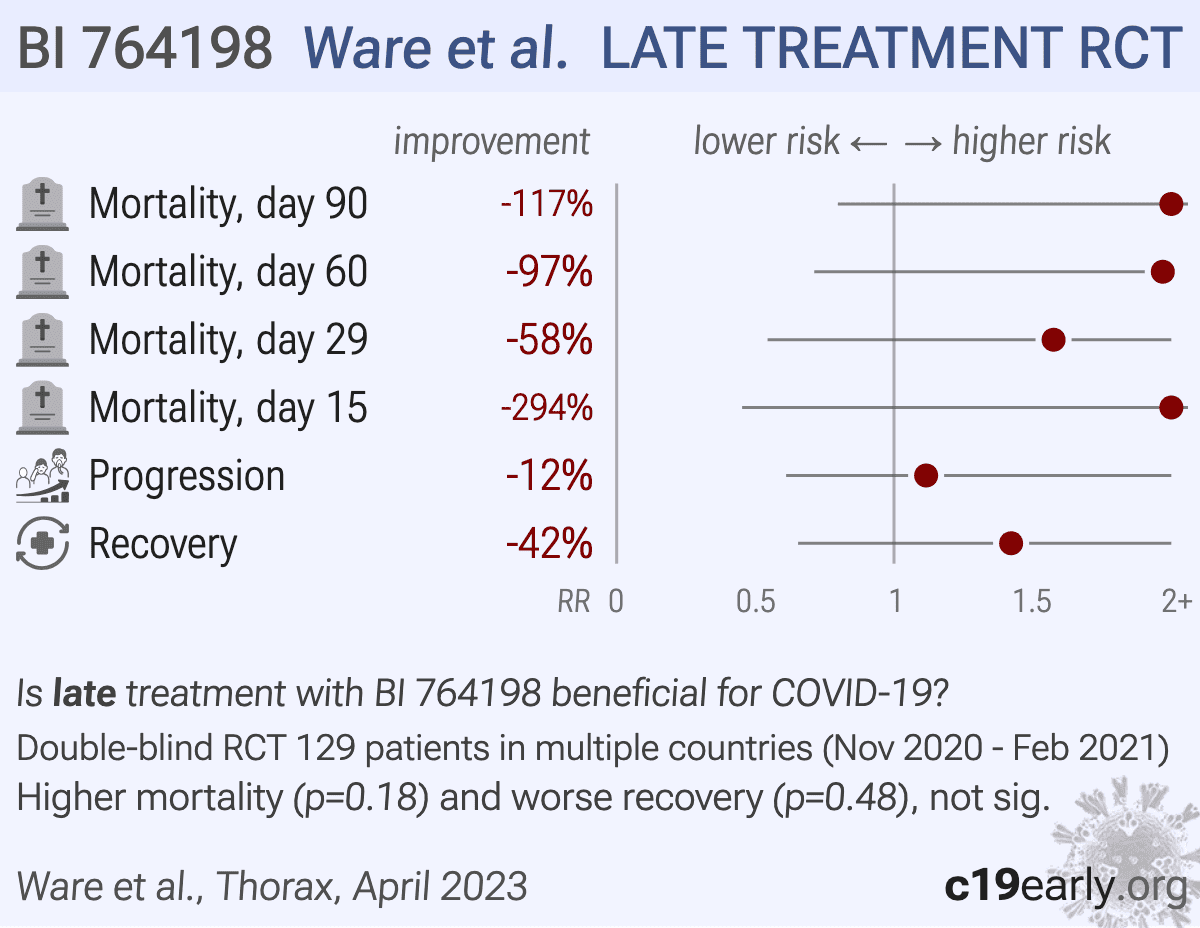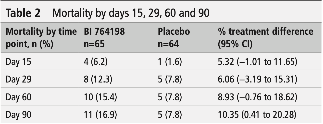 "abstract": "<jats:sec><jats:title>Background</jats:title><jats:p>Despite the availability of COVID-19 vaccinations, there remains a need to investigate treatments to reduce the risk or severity of potentially fatal complications of COVID-19, such as acute respiratory distress syndrome (ARDS). This study evaluated the efficacy and safety of the transient receptor potential channel C6 (TRPC6) inhibitor, BI 764198, in reducing the risk and/or severity of ARDS in patients hospitalised for COVID-19 and requiring non-invasive, supplemental oxygen support (oxygen by mask or nasal prongs, oxygen by non-invasive ventilation or high-flow nasal oxygen).</jats:p></jats:sec><jats:sec><jats:title>Methods</jats:title><jats:p>Multicentre, double-blind, randomised phase II trial comparing once-daily oral BI 764198 (n=65) with placebo (n=64) for 28 days (+2-month follow-up). Primary endpoint: proportion of patients alive and free of mechanical ventilation at day 29. Secondary endpoints: proportion of patients alive and discharged without oxygen (day 29); occurrence of either in-hospital mortality, intensive care unit admission or mechanical ventilation (day 29); time to first response (clinical improvement/recovery); ventilator-free days (day 29); and mortality (days 15, 29, 60 and 90).</jats:p></jats:sec><jats:sec><jats:title>Results</jats:title><jats:p>No difference was observed for the primary endpoint: BI 764198 (83.1%) versus placebo (87.5%) (estimated risk difference –5.39%; 95% CI –16.08 to 5.30; p=0.323). For secondary endpoints, a longer time to first response (rate ratio 0.67; 95% CI 0.46 to 0.99; p=0.045) and longer hospitalisation (+3.41 days; 95% CI 0.49 to 6.34; p=0.023) for BI 764198 versus placebo was observed; no other significant differences were observed. On-treatment adverse events were similar between trial arms and more fatal events were reported for BI 764198 (n=7) versus placebo (n=2). Treatment was stopped early based on an interim observation of a lack of efficacy and an imbalance of fatal events (Data Monitoring Committee recommendation).</jats:p></jats:sec><jats:sec><jats:title>Conclusions</jats:title><jats:p>TRPC6 inhibition was not effective in reducing the risk and/or severity of ARDS in patients with COVID-19 requiring non-invasive, supplemental oxygen support.</jats:p></jats:sec><jats:sec><jats:title>Trial registration number</jats:title><jats:p><jats:ext-link xmlns:xlink=\"http://www.w3.org/1999/xlink\" ext-link-type=\"clintrialgov\" xlink:href=\"NCT04604184\">NCT04604184</jats:ext-link>.</jats:p></jats:sec>",