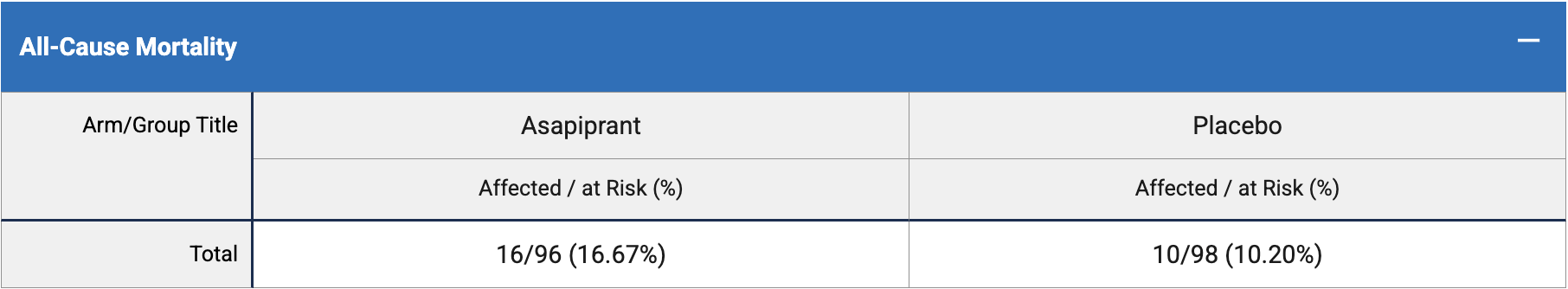 risk of death, 63.3% higher, RR 1.63, p = 0.21, treatment 16 of 96 (16.7%), control 10 of 98 (10.2%).