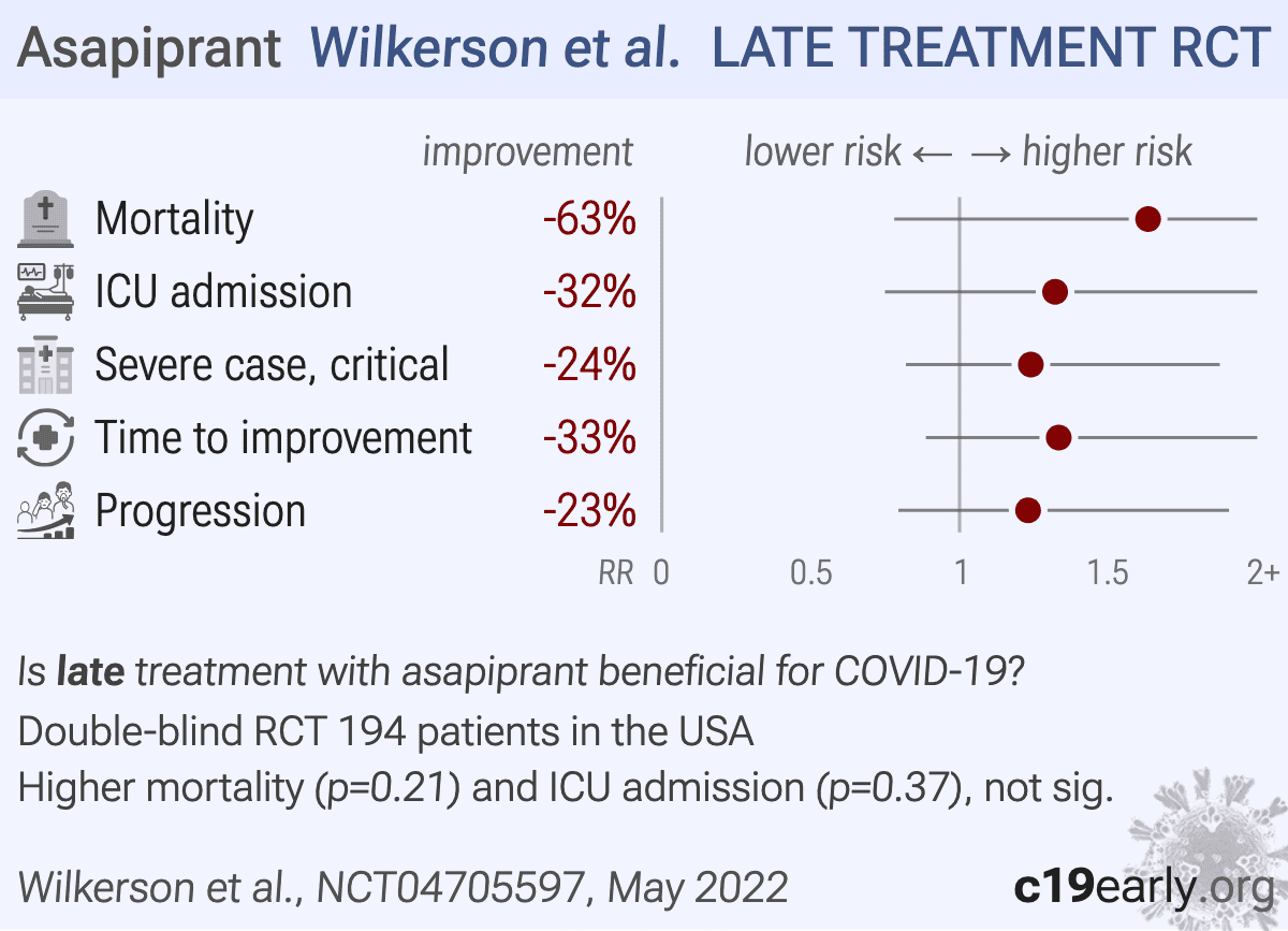 risk of ICU admission, 32.1% higher, RR 1.32, p = 0.37, treatment 22 of 96 (22.9%), control 17 of 98 (17.3%).