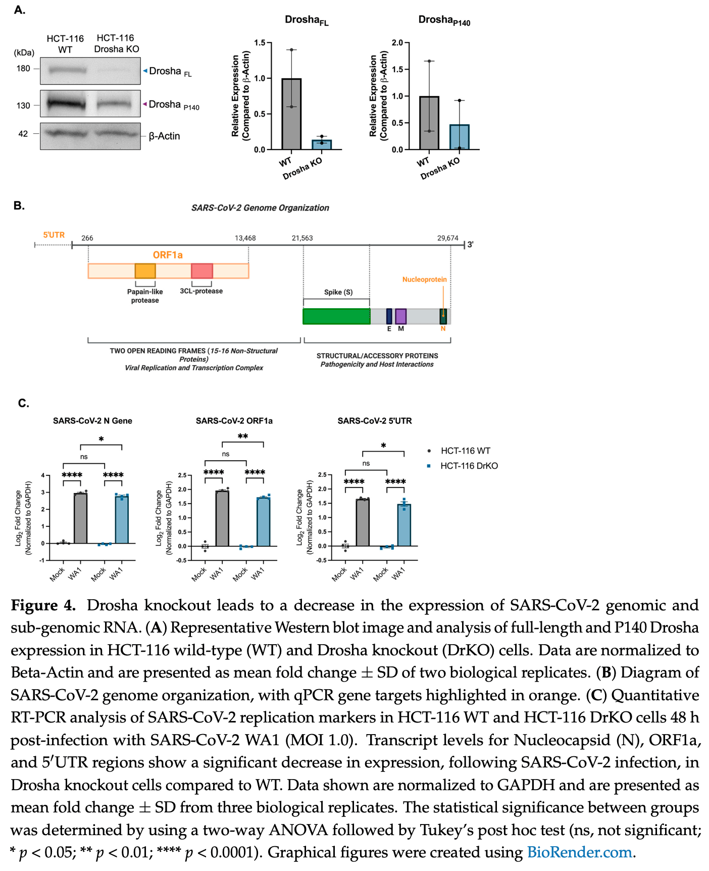 Supplementary Materials: The following supporting information can be downloaded at: https:// www.mdpi.com/article/10.3390/genes16101239/s1 , Figure S1 : The expression of key proteins within the miRNA biogenesis pathway, at the mRNA and protein level, following SARS-CoV-2 infection. (A) Western Blot of four proteins within the miRNA biogenesis pathway in mock and SARS-CoV-2-infected (MOI 1.0) NuLi-1 cells. Dicer expression is significantly decreased following infection. (B) qRT-PCR of the mRNA transcripts of four key proteins within the miRNA biogenesis pathway. Following infection there is no significant change in expression at the transcript level. Data are normalized to Beta-Actin or GAPDH and are presented as mean fold change ± SD from at least three independent experiments. The statistical significance between groups was determined using a two-tailed students T test, or two-way ANOVA followed by Tukey's post hoc test (ns, not significant; * p < 0.05); Figure S2 . siRNA knockdown confirmation of Drosha p140 and p25 isoforms. (A) Western blot validation of Drosha isoforms by siRNA knockdown. NuLi-1 cells were transfected with 100 pmol Drosha-specific siRNA (siDrosha) or a non-targeting control siRNA (siControl). Western blotting shows a marked reduction in both FL and cleavage product (P140 and P25) bands in siDrosha-treated cells, confirming their identity as Drosha-specific. (B) qRT-PCR quantification showed a significant reduction in Drosha mRNA expression. Data..