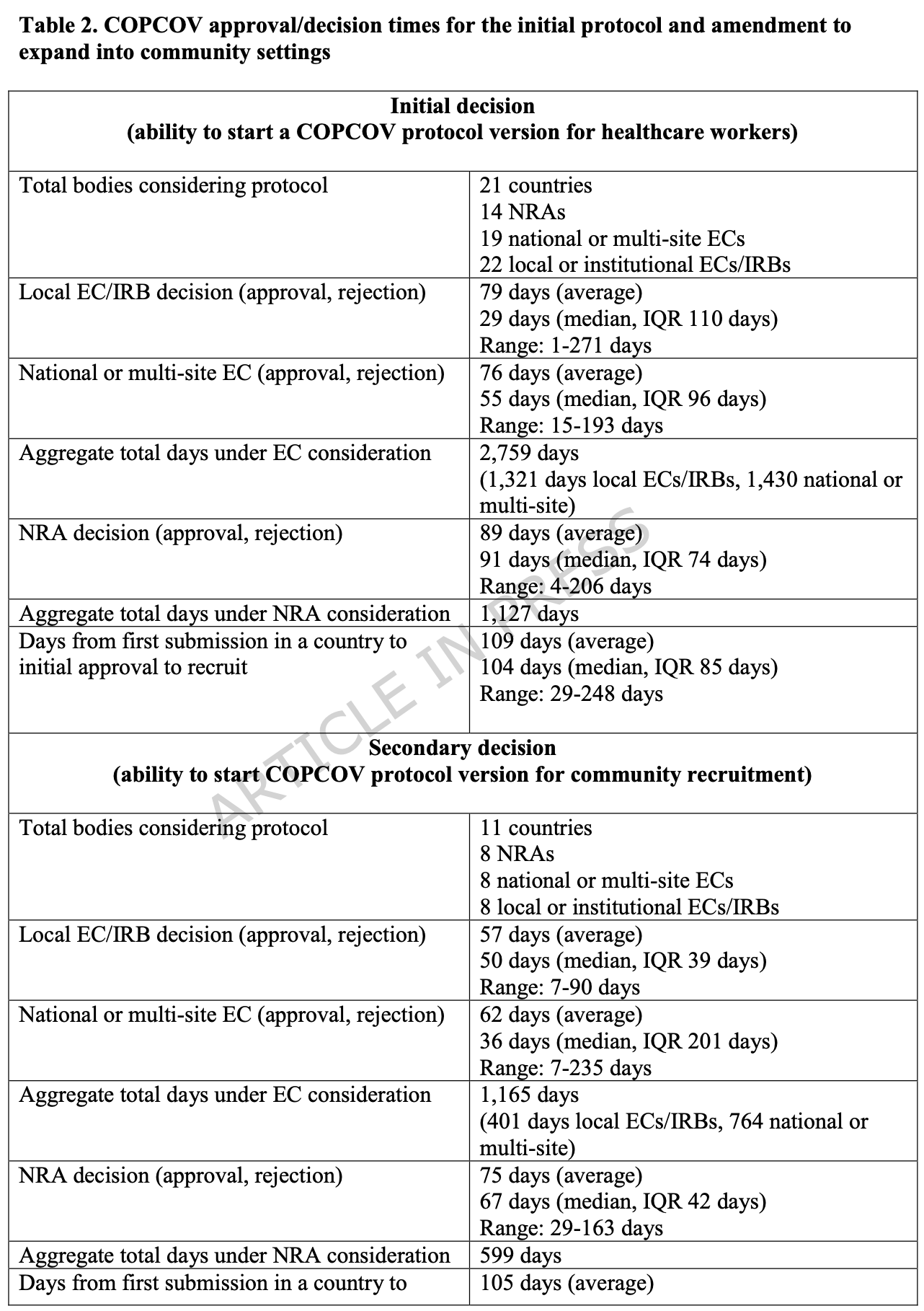 Analysis of bureaucratic approval delays in the multi-country COVID-19 COPCOV trial, showing a median decision time of 104 days across 76 countries, despite expedited emergency review processes. The trial missed critical early COVID-19 waves due to these delays, recruiting less than 5,000 of the planned 40,000 healthcare workers. Sequential rather than parallel reviews, lack of transparency in decision-making, and inflexibility in risk assessment were identified as major barriers. The fraudulent Mehra et al. Lancet paper linking HCQ to cardiotoxicity, though quickly retracted, caused additional months-long delays across multiple countries. Authors argue these approval delays represent a "risk of therapeutic inertia" where bureaucratic risk-aversion overlooks the potential harms of delaying potentially beneficial treatments during health emergencies. The study highlights how existing frameworks for expedited pandemic research approvals largely failed in practice, with even WHO Africa's AVAREF system taking 50+ days instead of the promised 10 days for approvals.
