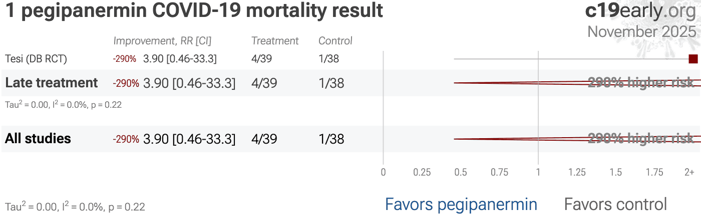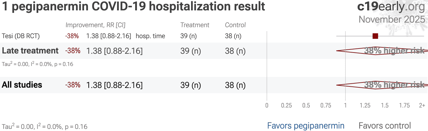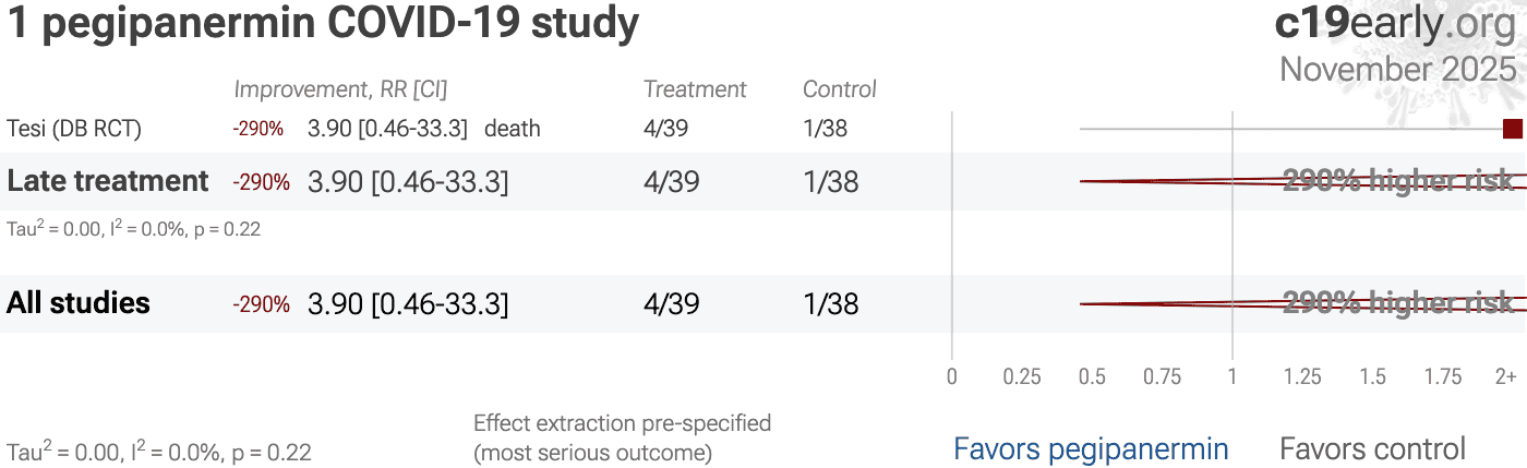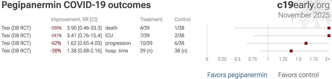 | 290% higher mortality (p=0.36), 241% higher ICU admission (p=0.15), 62% higher progression (p=0.4), and 38% longer hospitalization (p=0.16). RCT 79 hospitalized COVID-19 patients showing no significant differences with pegipanermin (INB03) treatment. | ||