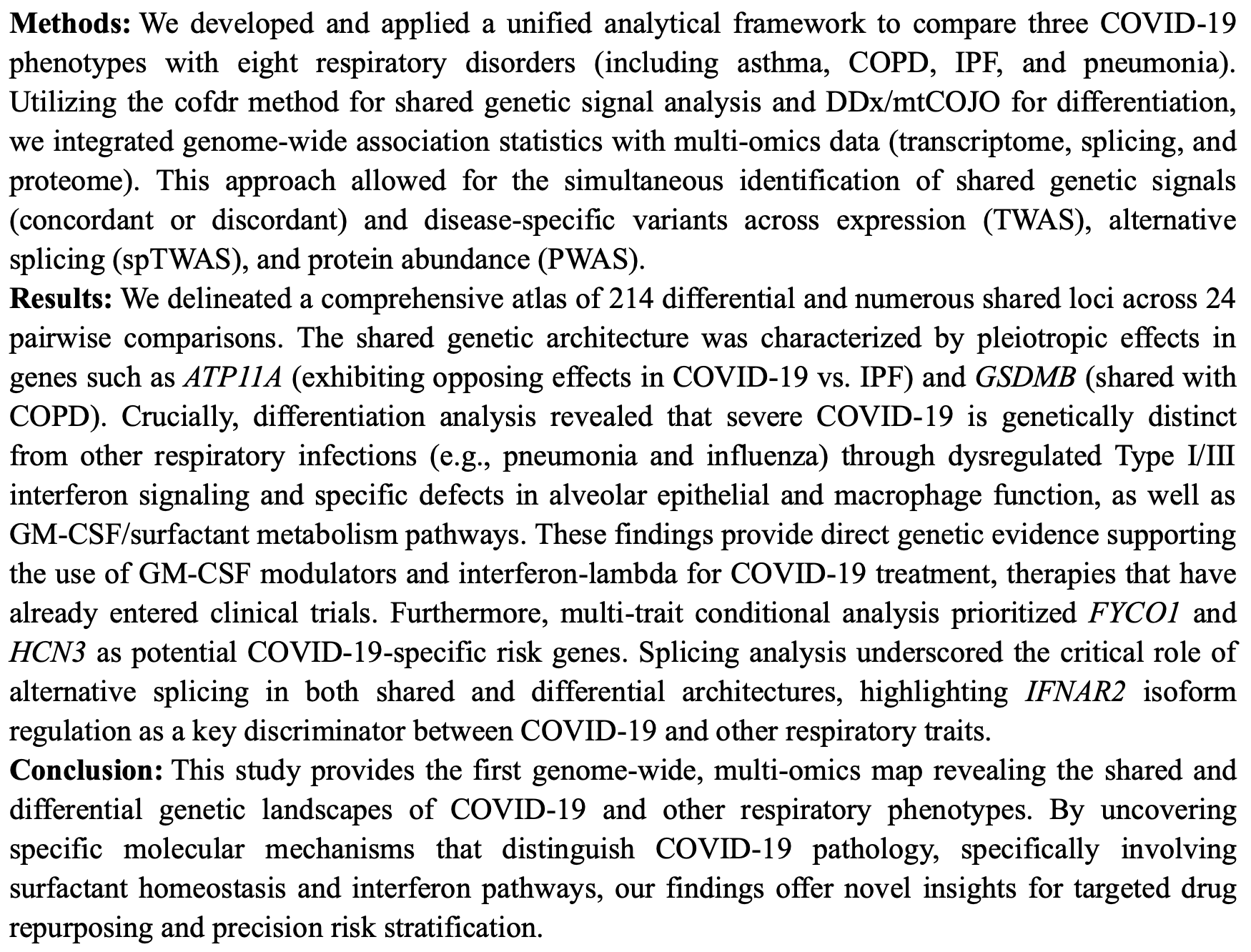 "abstract": "<jats:title>Abstract</jats:title>\n <jats:sec>\n <jats:title>Background</jats:title>\n <jats:p>A bidirectional relationship has been observed between COVID-19 and respiratory disorders, where respiratory comorbidities increase severity and COVID-19 induces respiratory sequelae. The underlying biological and genetic mechanisms remain unclear. While previous studies have identified overlapping genetic loci, few have systematically disentangled the genetic factors shared between these conditions versus those specific to COVID-19, particularly at a multi-omics level.</jats:p>\n </jats:sec>\n <jats:sec>\n <jats:title>Methods</jats:title>\n <jats:p>We developed and applied a unified analytical framework to compare three COVID-19 phenotypes with eight respiratory disorders (including asthma, COPD, IPF, and pneumonia). Utilizing the cofdr method for shared genetic signal analysis and DDx/mtCOJO for differentiation, we integrated genome-wide association statistics with multi-omics data (transcriptome, splicing, and proteome). This approach allowed for the simultaneous identification of shared genetic signals (concordant or discordant) and disease-specific variants across expression (TWAS), alternative splicing (spTWAS), and protein abundance (PWAS).</jats:p>\n </jats:sec>\n <jats:sec>\n <jats:title>Results</jats:title>\n <jats:p>\n We delineated a comprehensive atlas of 214 differential and numerous shared loci across 24 pairwise comparisons. The shared genetic architecture was characterized by pleiotropic effects in genes such as\n <jats:italic>ATP11A</jats:italic>\n (exhibiting opposing effects in COVID-19 vs. IPF) and\n <jats:italic>GSDMB</jats:italic>\n (shared with COPD). Crucially, differentiation analysis revealed that severe COVID-19 is genetically distinct from other respiratory infections (e.g., pneumonia and influenza) through dysregulated Type I/III interferon signaling and specific defects in alveolar epithelial and macrophage function, as well as GM-CSF/surfactant metabolism pathways. These findings provide direct genetic evidence supporting the use of GM-CSF modulators and interferon-lambda for COVID-19 treatment, therapies that have already entered clinical trials. Furthermore, multi-trait conditional analysis prioritized\n <jats:italic>FYCO1</jats:italic>\n and\n <jats:italic>HCN3</jats:italic>\n as potential COVID-19-specific risk genes. Splicing analysis underscored the critical role of alternative splicing in both shared and differential architectures, highlighting\n <jats:italic>IFNAR2</jats:italic>\n isoform regulation as a key discriminator between COVID-19 and other respiratory traits.\n </jats:p>\n </jats:sec>\n <jats:sec>\n <jats:title>Conclusion</jats:title>\n <jats:p>This study provides the first genome-wide, multi-omics map revealing the shared and differential genetic landscapes of COVID-19 and other respiratory phenotypes. By uncovering specific molecular mechanisms that distinguish COVID-19 pathology, specifically involving surfactant homeostasis and interferon pathways, our findings offer novel insights for targeted drug repurposing and precision risk stratification.</jats:p>\n </jats:sec>",