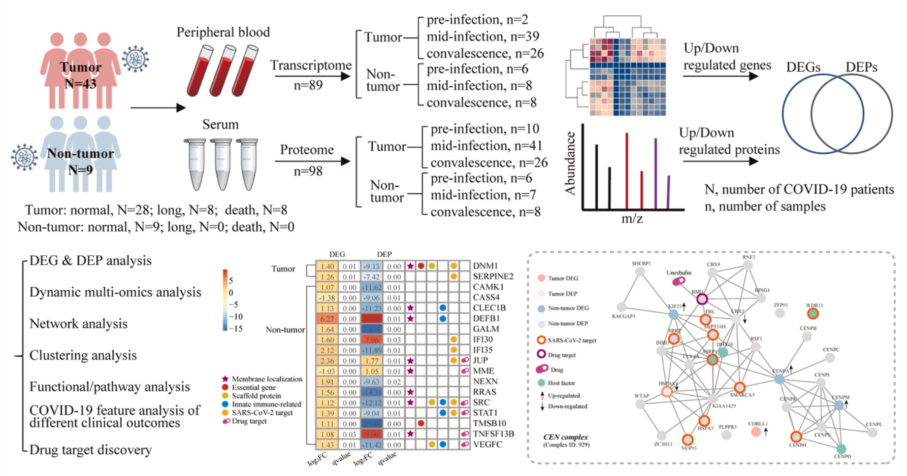 This multi-omics study reveals distinct immune dysregulation in hematological tumor patients with COVID-19, showing severe proteomic network perturbations and divergent immune signatures between long COVID (immunosuppression) and fatal cases (hyperactivation). Network analysis identifies potential therapeutic targets (e.g., HSPA8, SRC, and STAT1) and drug candidates, offering insights into COVID-19 mechanisms and tailored treatment strategies for high-risk patients.
