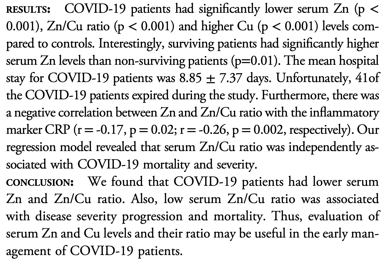 "abstract": "<jats:title>Abstract</jats:title>\n <jats:sec>\n <jats:title>Background</jats:title>\n <jats:p>COVID-19, caused by the SARS-CoV-2 virus, can trigger a severe cascade of inflammatory responses in the body, called cytokine storm, leading to acute respiratory distress syndrome and other complications associated with COVID-19. Zinc (Zn) and copper (Cu) are among the most abundant trace elements in the human body and have various anti-inflammatory properties that affect the innate and adaptive immune systems. The objective of this study was to evaluate the association of Zn and Cu levels and Zn/Cu ratio with COVID-19 severity and mortality.</jats:p>\n </jats:sec>\n <jats:sec>\n <jats:title>Methods</jats:title>\n <jats:p>A total of 220 COVID-19 patients and 220 healthy age- and sex-matched controls were enrolled in this study. The COVID 19 diagnosis was confirmed by positive qRT-PCR and clinical criteria (signs, respiratory symptoms and chest CT findings). Clinicopathologic characteristics of COVID-19 patients and relevant laboratory parameters including WBC, platelet count, hemoglobin, albumin, blood glucose, kidney and liver function tests, lactate dehydrogenase, creatine phosphokinase, blood coagulation tests, D-dimer, iron, inflammatory marker CRP, electrolytes Na, K, Ca, P, Mg, Zn and Cu levels were assessed at hospital admission.</jats:p>\n </jats:sec>\n <jats:sec>\n <jats:title>Results</jats:title>\n <jats:p>COVID-19 patients had significantly lower serum Zn (p &lt; 0.001), Zn/Cu ratio (p &lt; 0.001) and higher Cu (p &lt; 0.001) levels compared to controls. Interestingly, surviving patients had significantly higher serum Zn levels than non-surviving patients (p=0.01). The mean hospital stay for COVID-19 patients was 8.85 ± 7.37 days. Unfortunately, 41of the COVID-19 patients expired during the study. Furthermore, there was a negative correlation between Zn and Zn/Cu ratio with the inflammatory marker CRP (r = -0.17, p = 0.02; r = -0.26, p = 0.002, respectively). Our regression model revealed that serum Zn/Cu ratio was independently associated with COVID-19 mortality and severity.</jats:p>\n </jats:sec>\n <jats:sec>\n <jats:title>Conclusion</jats:title>\n <jats:p>We found that COVID-19 patients had lower serum Zn and Zn/Cu ratio. Also, low serum Zn/Cu ratio was associated with disease severity progression and mortality. Thus, evaluation of serum Zn and Cu levels and their ratio may be useful in the early management of COVID-19 patients.</jats:p>\n </jats:sec>",