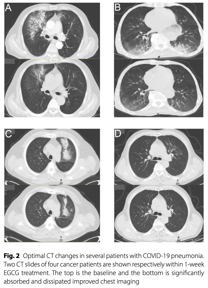 Phase I/II trial of EGCG nebulization inhalation in 54 COVID-19 pneumonia patients with cancer showing good tolerability and improvement in CT scans in 56% of patients after 7 days, with non-progression of pneumonia in 82% of patients. There was no significant difference in inflammation-related laboratory parameters before and after treatment. The maximum tolerated dose was 5878 μmol/L.