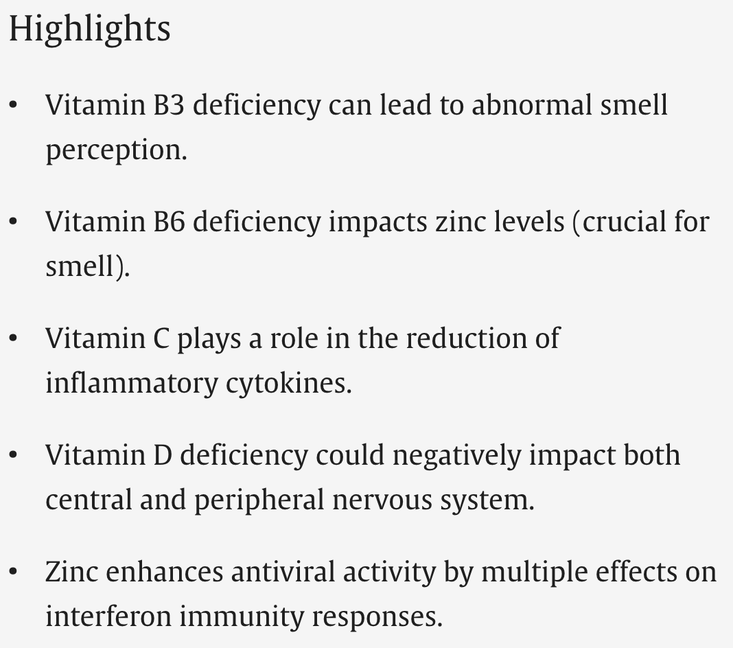 Review of the influence of micronutrients on olfactory dysfunction associated with COVID-19 and long COVID. Author investigates how dietary supplements like vitamins A, B, C, D, E, zinc, and alpha-lipoic acid can help restore the sense of smell by reducing localized inflammation and supporting neuroregeneration in the olfactory epithelium.