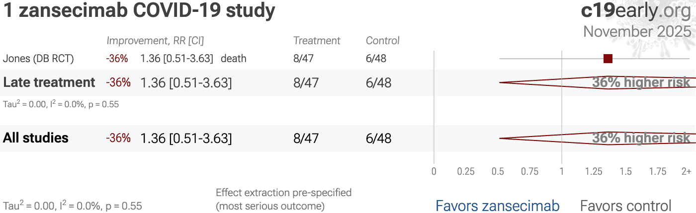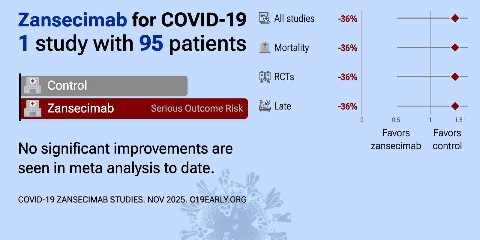 | 36% higher mortality (p=0.58) and 70% higher combined mortality/intubation (p=0.28). RCT 95 hospitalized patients with COVID-19 pneumonia showing no significant differences with zansecimab (LY3127804, anti-Angiopoietin-2 antibody). | ||