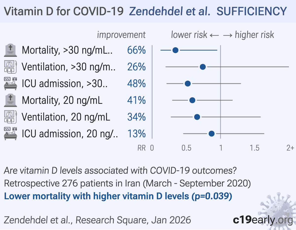 risk of death, 41.2% lower, OR 0.59, p = 0.13, high D levels (≥20 ng/mL) 145, low D levels (<20 ng/mL) 131, adjusted per study, inverted to make OR<1 favor high D levels (≥20 ng/mL), multivariable, RR approximated with OR.