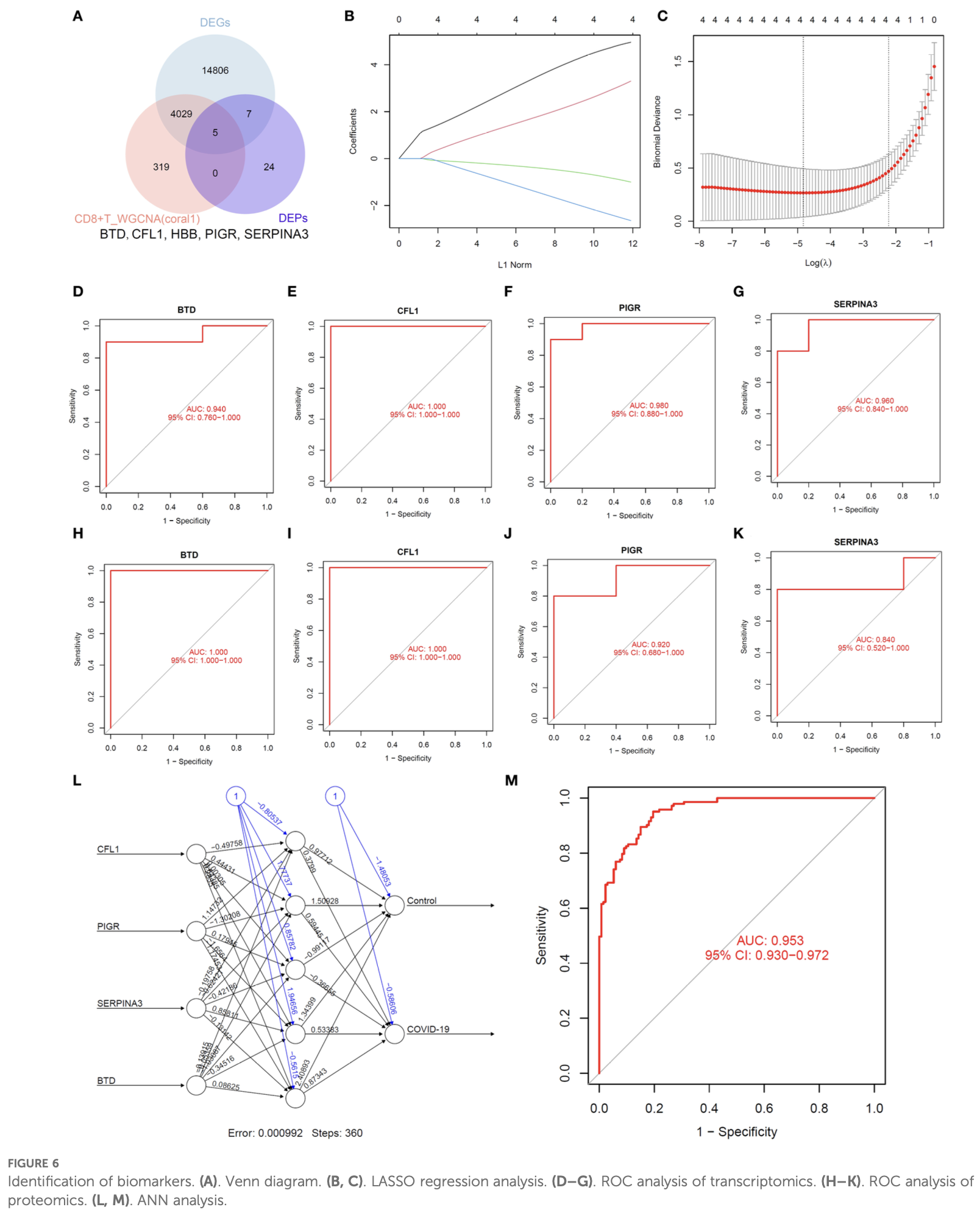 "abstract": "<jats:sec><jats:title>Introduction</jats:title><jats:p>COVID-19 has caused over 7 million deaths worldwide since its onset in 2019, and the virus remains a significant health threat. Identifying sensitive and specific biomarkers, along with elucidating immune-mediated mechanisms, is essential for improving the diagnosis, treatment, and prevention of COVID-19. To predict key molecular markers of COVID-19 using an established multi-omics framework combined with machine learning models.</jats:p></jats:sec><jats:sec><jats:title>Methods</jats:title><jats:p>We conducted an integrated analysis of single-cell RNA sequencing (scRNA-seq), bulk RNA sequencing, and proteomics data to identify critical biomarkers associated with COVID-19. The multi-omics approach enabled the characterization of gene expression dynamics and alterations in immune cell subsets in COVID-19 patients. Machine learning techniques and molecular docking analyses were employed to identify biomarkers and therapeutic targets within the disease’s pathophysiological network.</jats:p></jats:sec><jats:sec><jats:title>Results</jats:title><jats:p>Principal component analysis effectively grouped samples based on clinical characteristics. Using random forest and SVM-RFE models, we identified clinical indicators capable of accurately distinguishing COVID-19 patients. Transcriptomic analysis, including scRNA-seq, highlighted the pivotal role of CD8<jats:sup>+</jats:sup> T cells, and WGCNA identified related module genes. Proteomic analysis, integrated with machine learning, revealed 36 DEPs. Further investigation identified several genes associated with monocyte proportions. Correlation analysis showed that BTD, CFL1, PIGR, and SERPINA3 were strongly linked to CD8<jats:sup>+</jats:sup> T cell abundance in COVID-19 patients. ROC curve analysis demonstrated that these genes could effectively distinguish between COVID-19 patients and healthy individuals. Concordant findings from both transcriptomic and proteomic levels support BTD, CFL1, PIGR, and SERPINA3 as potential auxiliary diagnostic markers. Finally, AlphaFold-based molecular docking analysis suggested these biomarkers may also serve as candidate therapeutic targets.</jats:p></jats:sec><jats:sec><jats:title>Discussion</jats:title><jats:p>Preliminary findings indicate that BTD, CFL1, PIGR, and SERPINA3 are vital molecular biomarkers related of CD8+ T cell, providing new insights into the molecular mechanisms and long-term prevention of COVID-19.</jats:p></jats:sec>",