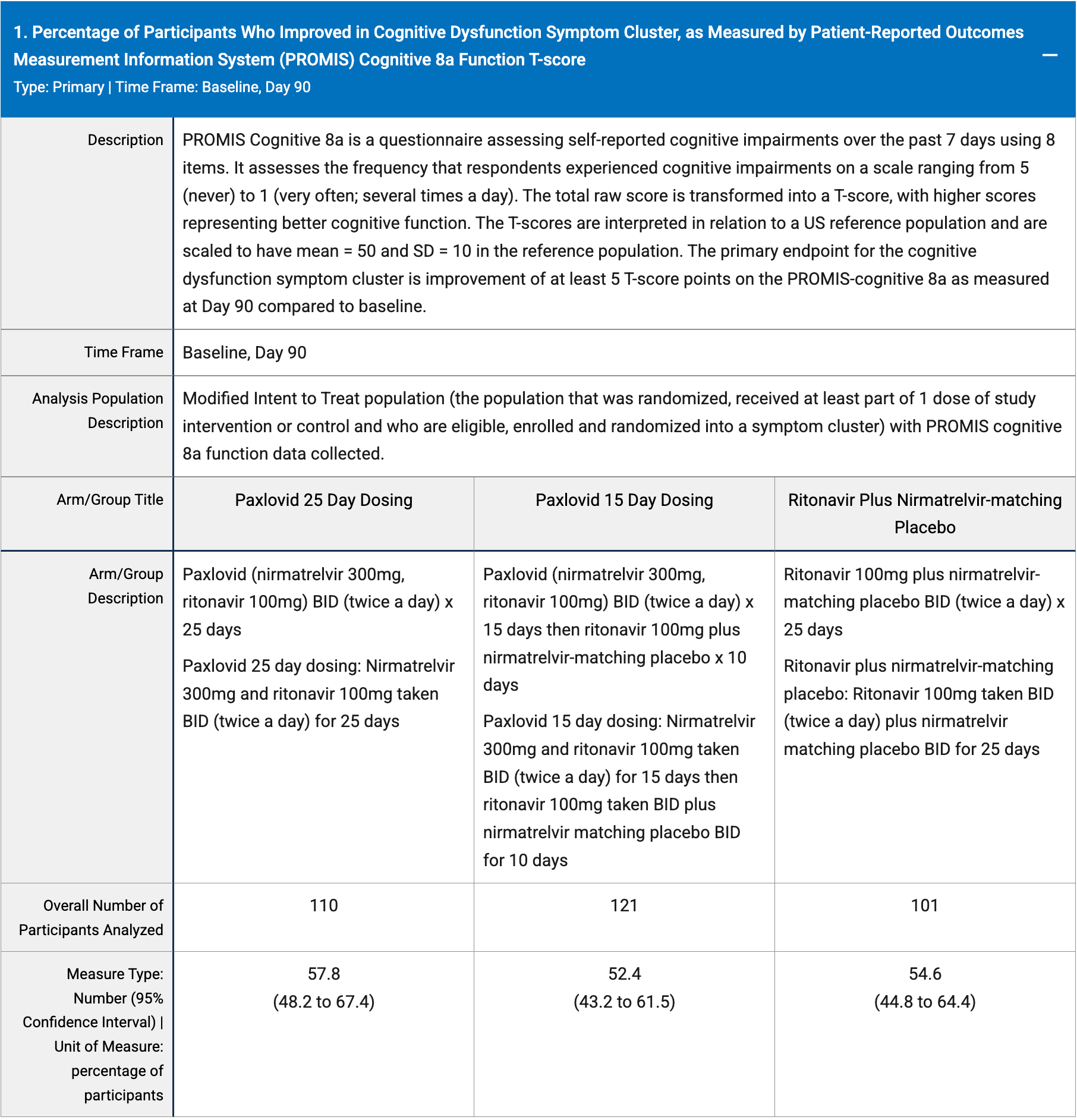 While authors have not published the results, in the same month as the results appeared in the registry, they published a design paper that states: “While the STOP-PASC and PAX LC trials did not demonstrate a positive effect on Long COVID, the RECOVER-VITAL study remains a critical addition to the field and still has potential for demonstrating effect...”2.